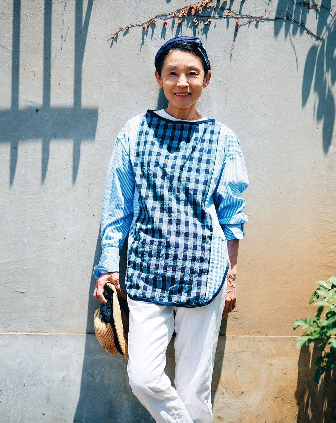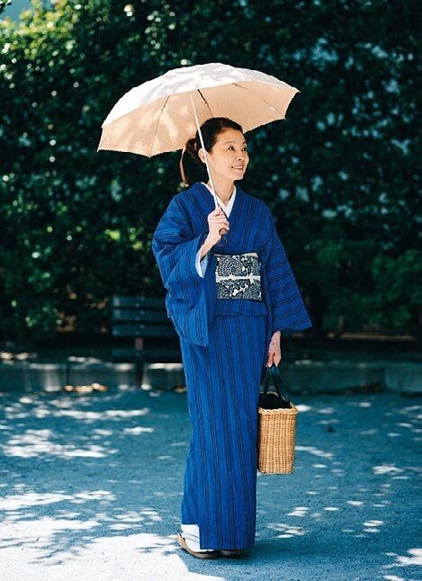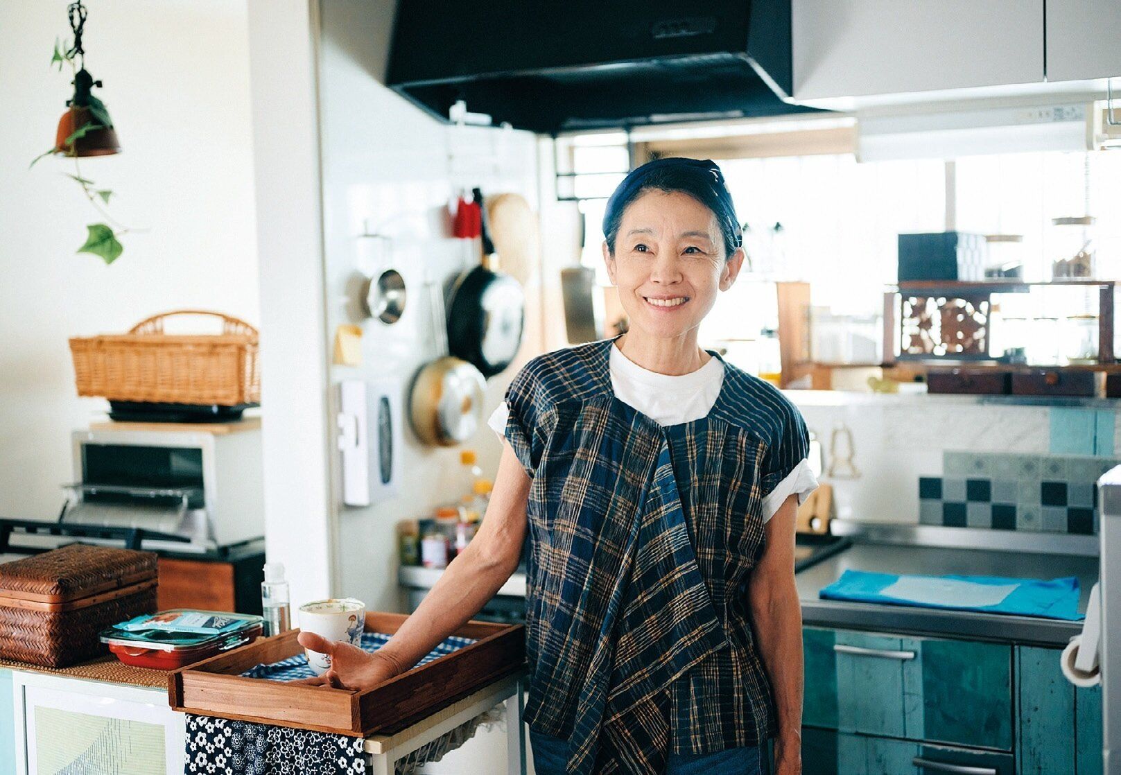 着物は普段使いで楽しみたいから、年を重ねてからはリーズナブルな物を選ぶように。鮮やかな青の木綿の着物は5年前に買った掘り出し物。「着物を着ると近所の公園を散歩するだけでも気分がいいんです。木綿の着物はお手入れもラク。自分で洗濯しています」。