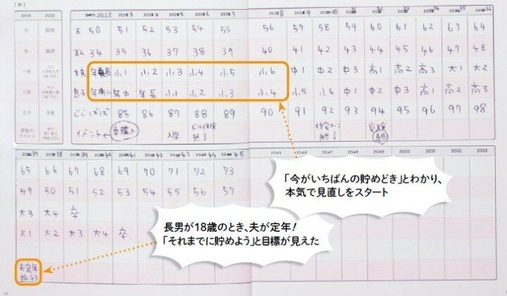 「家族の年齢を書くだけで、夫の定年の時期が意識できるように。今から教育費と老後資金を同時に貯めていくためにどうしたらいいか考えるきっかけに」。