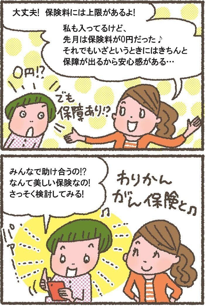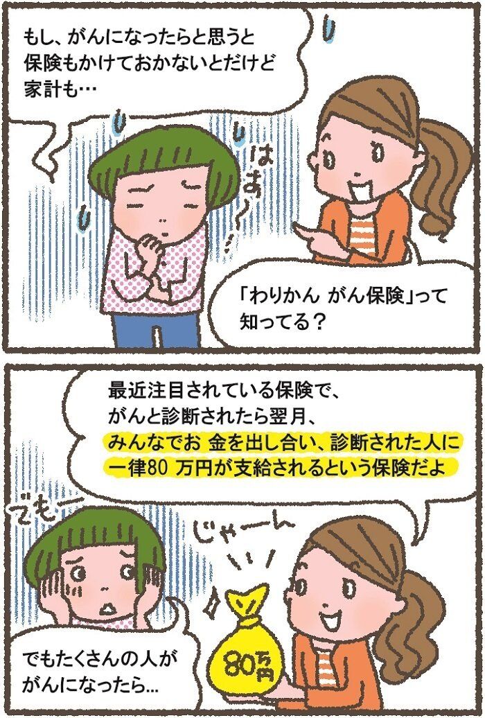 保障内容は、がんと診断されたら一律80万円の受け取り。がんの医療費の窓口負担分は一般的に25万~60万円程度といわれているので、カバーできる金額です。みんなで助け合うという考え方はすてきだし、なにより、必要なときに必要なぶんだけ支払うというのは合理的で、納得感がありますよね。