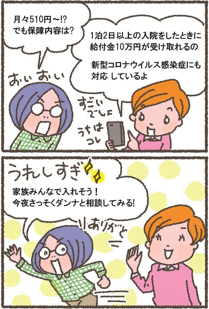最近の傾向として、1カ月以上の長期入院はほとんどないのに加え、高額療養費制度で医療費の自己負担には限度額があり、標準世帯(年収約370万~770万円)なら医療費がどんなにかかっても自己負担は月9万円程度まで。だから、10万円という給付額は十分安心できる設定です。新型コロナウイルスにも対応しているので、withコロナ時代にも備えることができるんです。