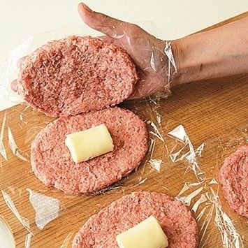 折りたたんだスライスチーズを2枚のたねではさんで縁をとじれば、ハンバーグを切ったときチーズがとろ~り