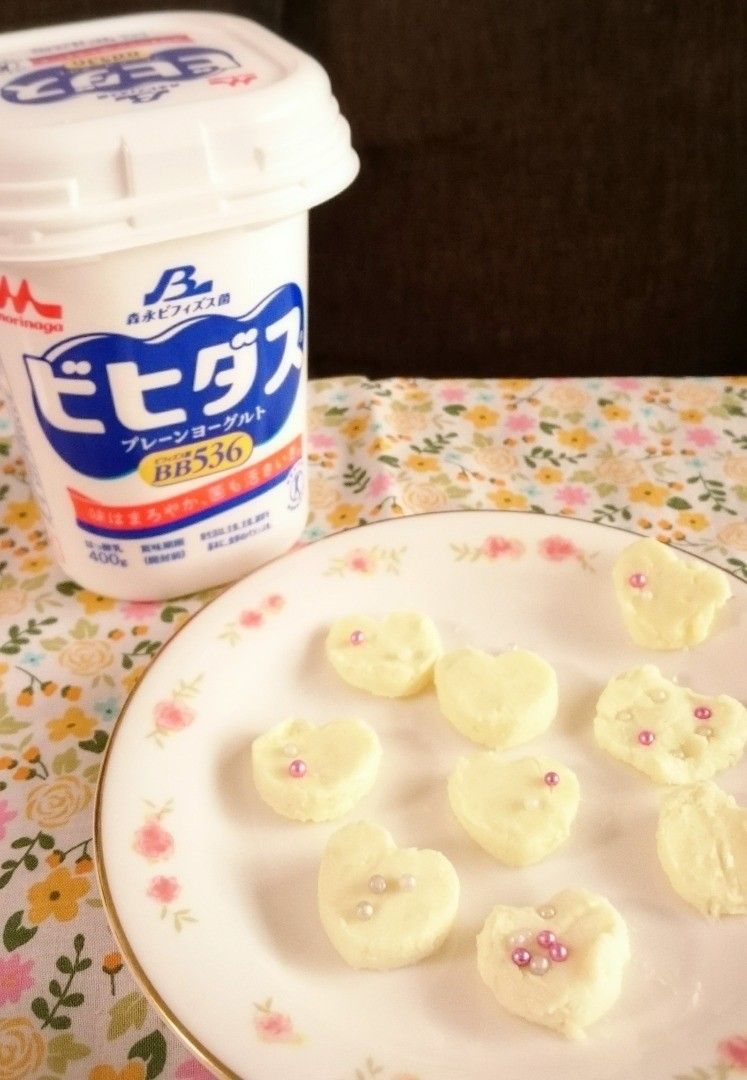 「チョコレートが大好き!」という こばやしなつみ さんが作ってくれたのは、生チョコのようになめらかな口どけのヨーグルトショコラ。ビヒダスプレーンヨーグルト120gを冷蔵庫で6時間水切りし、溶かしたホワイトチョコレート180gと湯せんで温めながら混ぜ合わせます。なめらかになったらバットなどに流し込んで冷蔵庫で冷やし、切り分ければ完成です。アラザンをトッピングするとさらにおしゃれに♪