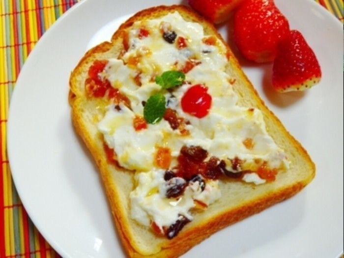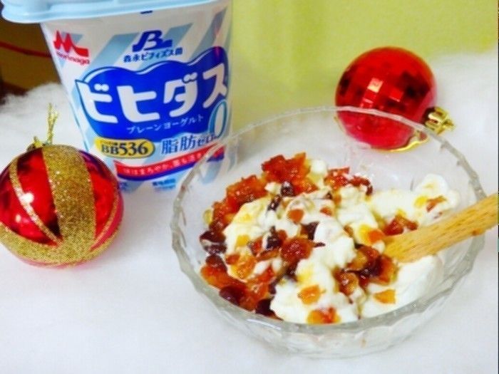 <ヨーグルト>×<ミックスドライフルーツ>でクリスマスの時期にぴったりのトーストを使って作ってくれたのはサンキュ!ブロガーのしーーばさん。水きりヨーグルトが濃厚なクリームチーズのような味わいになることを活かしたアレンジです。ヨーグルトに脂肪0タイプのビヒダスを使えば、濃厚だけどとってもヘルシーでカロリーも気になりません。
