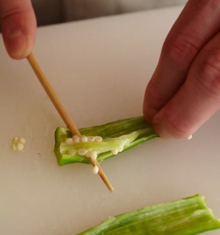 半分に割ったオクラの種を竹串を使ってとります。ちょっと細かい作業ですが、緑色がいっそう鮮やかになります。この汁を使った、夏におすすめのごちそう麺を教えていただきました。