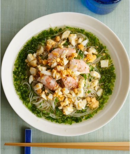そうめんは表示通りにゆでて氷水に取り、水けをきって器に盛る。3を注いでえびと卵を彩りよく散らし、白いりごまをふる。