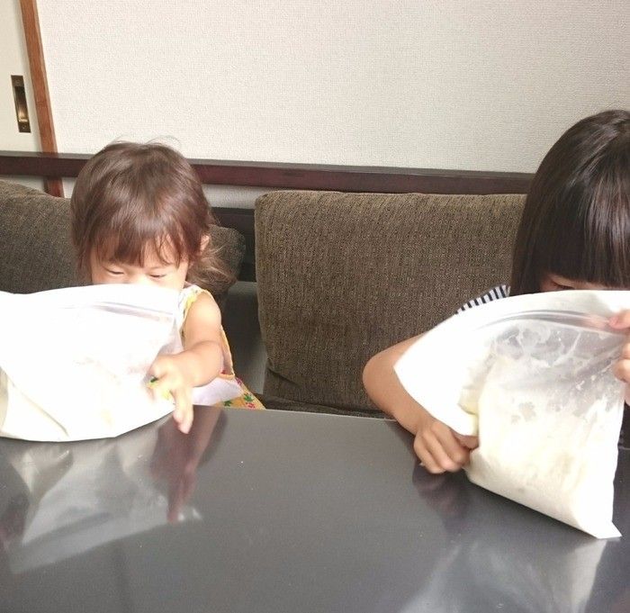 お子さんにバナナヨーグルトドリンクを作ってもらったのは、サンキュ!ブロガーのこばやしなつみさん。バナナをフォークで粗くつぶし、ビヒダス プレーンヨーグルトとりんごジュース、はちみつをファスナーつきの袋に入れてもみもみ♪