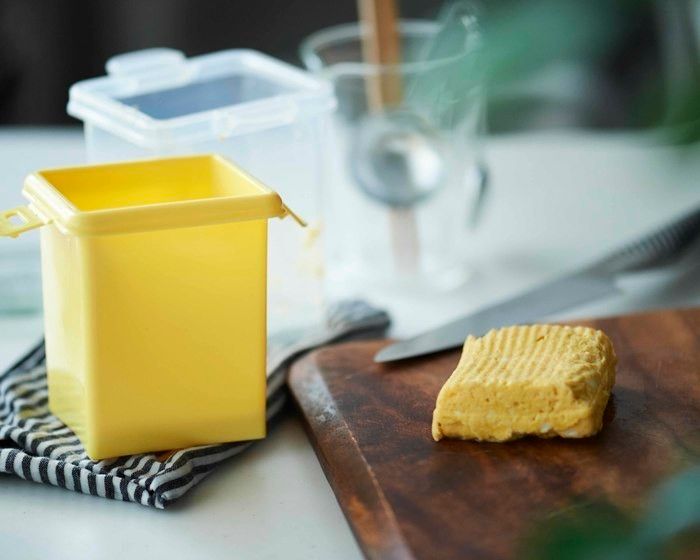 透明の容器に材料を入れて混ぜ、電子レンジでチン。取り出して、押し型用の黄色い容器で成形するだけで、卵1個分の卵焼きがあっという間に完成。ボウルもフライパンも油も使わないから、洗い物もラク! おべんとう作りに大活躍します。「レンジで簡単!!だし巻きたまご」\\108/ダイソー
