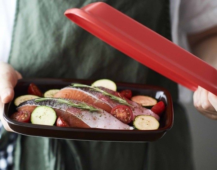 材料をのせ、ふたをして電子レンジでチンするだけ。ふたについているツマミを開閉することで、焼き料理と蒸し料理が思いのまま。洗い物もにおいもイヤな焼き魚が短時間で、ふっくらできて感動☆ レシピブックつきです。「マイクロウェーブヒート プレートS」¥4,104/クリヤマ
