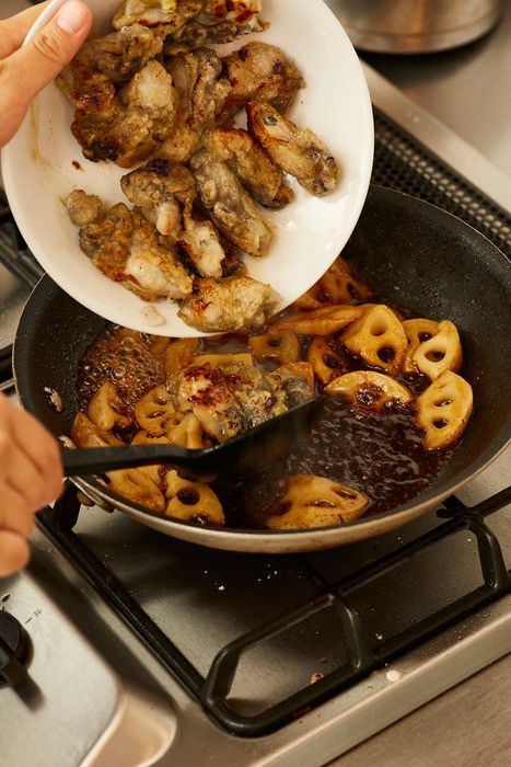 2のフライパンにれんこんを入れてさっと炒める。黒酢あんの材料を加え、煮立ったら2を戻し入れて炒め、とろみがついてきたらにらを加え、ひと混ぜして火を止める。