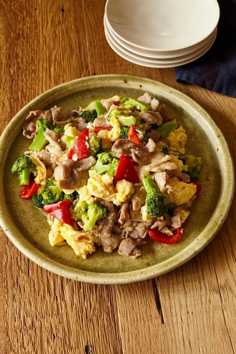 緑黄色野菜の炒めものは、肉のほか、いり卵も入れて栄養満点に! 豚肉とブロッコリーと卵のしょうゆ炒め