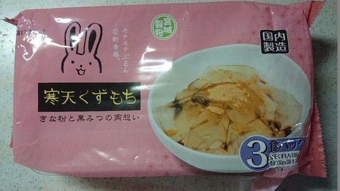 お次は寒天くずもちです。3セット入って298円で、セット内容はくずもち、きな粉、黒蜜となっています。うれしいのは、なかなかのビッグサイズで賞味期限も長め、さらには国産ということ!寒天ですが、モチモチ感もちゃんとあっておすすめの和風スイーツです。