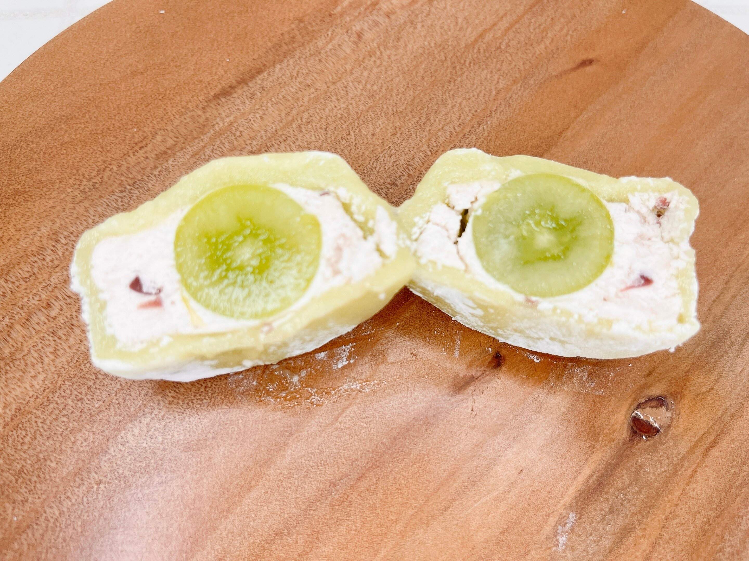 そして丸々1粒入っているシャインマスカットがとってもジューシーで、ミルキーなホイップクリームと大福生地と口の中でマッチして衝撃の美味しさです。大き過ぎず、小さ過ぎず、おやつにちょうどいいサイズですよ!