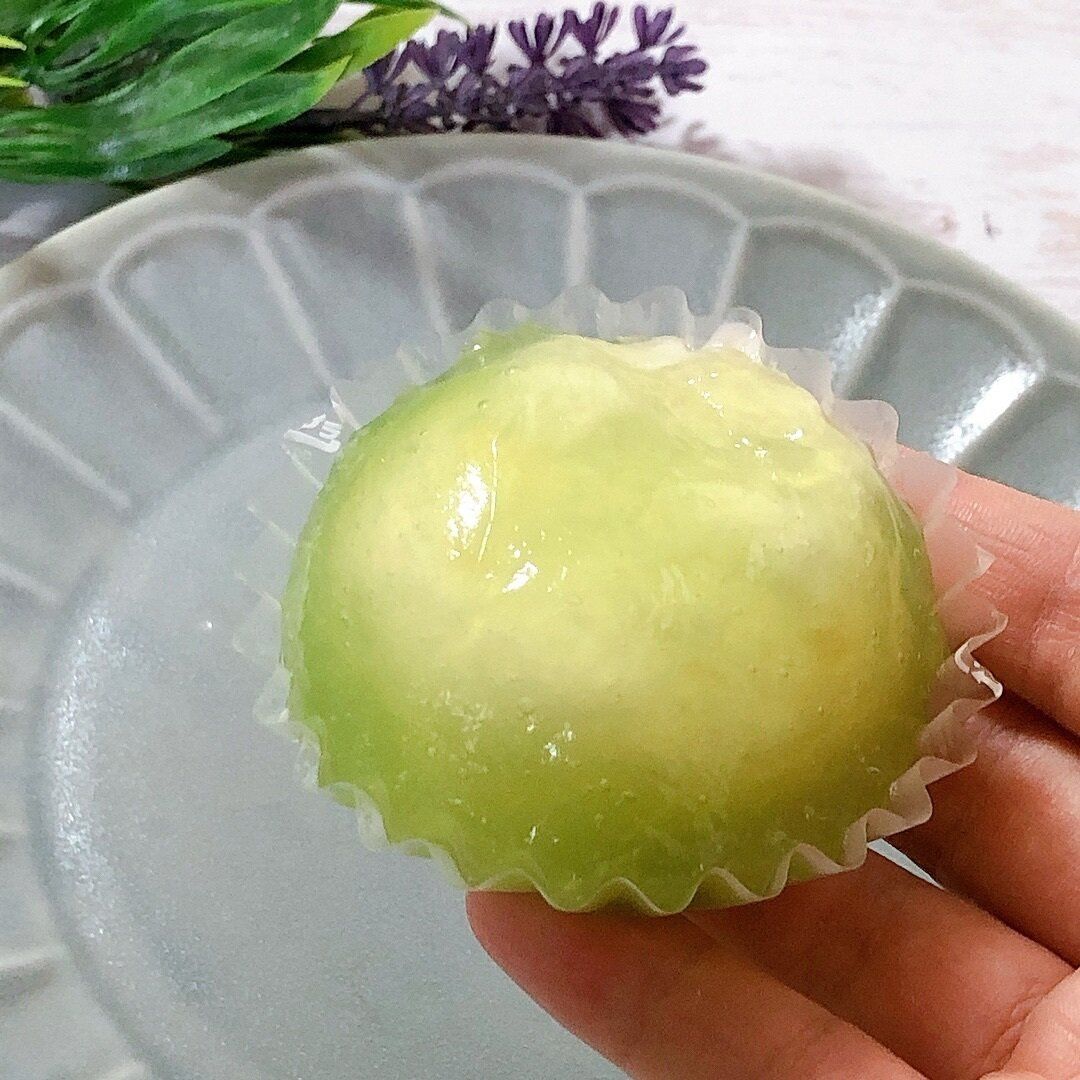 透き通った鮮やかなメロン色で、てかてかと光沢のあるわらび餅皮。パッケージを開けると、メロンソーダの香りが広がり、夏らしい気分が高まります。