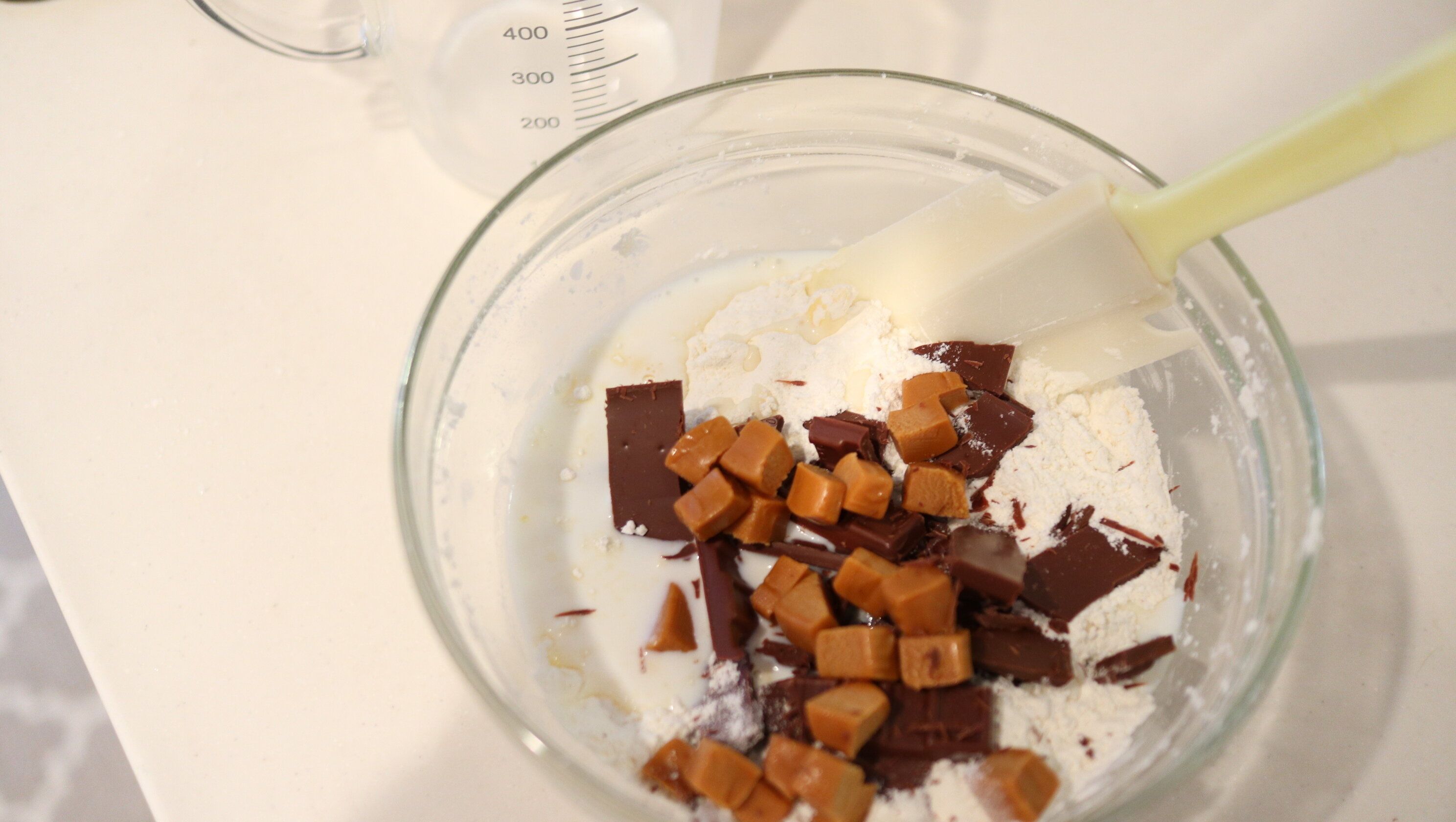 生地がポロポロしてきたら、牛乳・刻んでおいたキャラメル・板チョコを入れていきます。