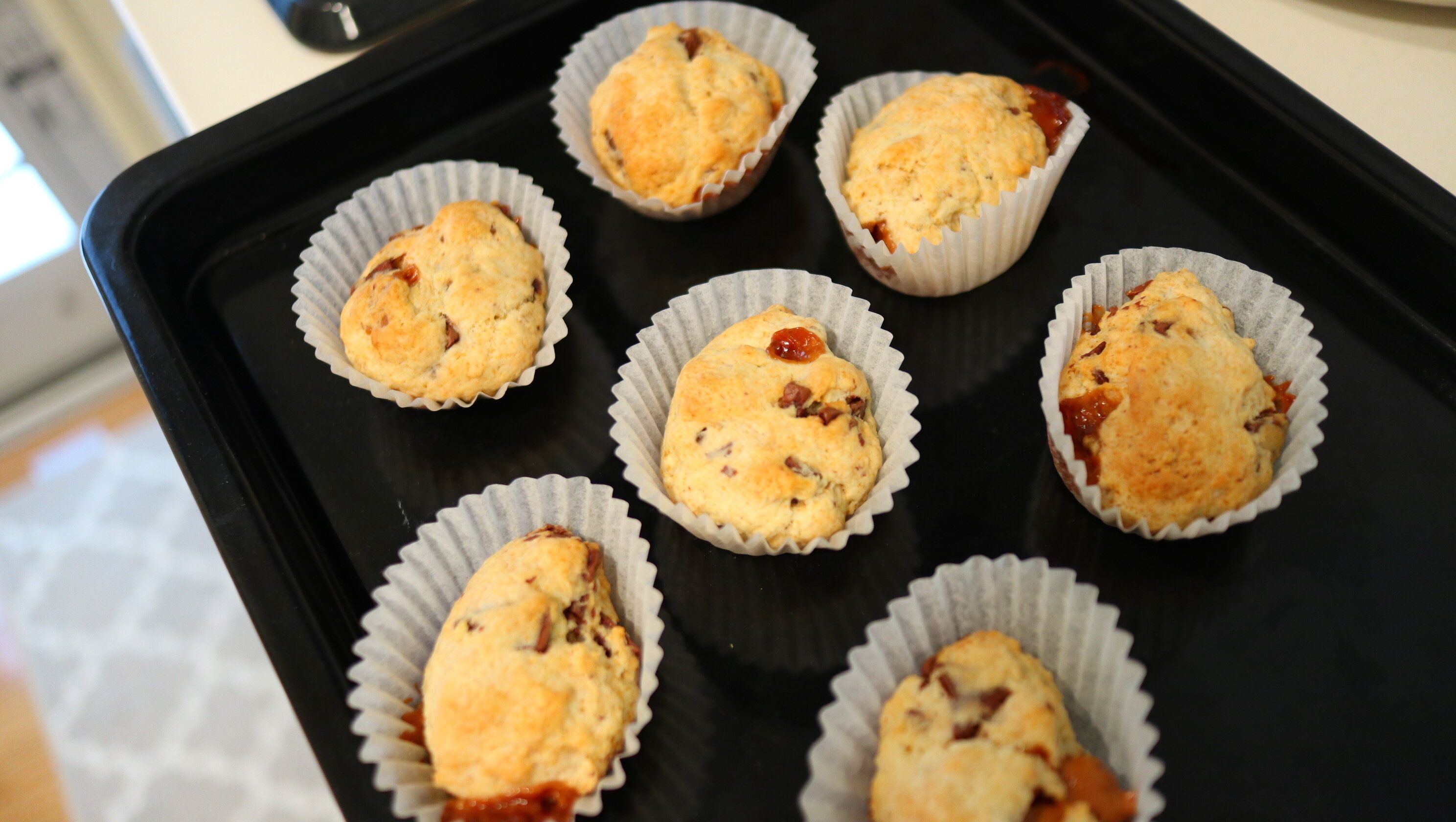 こんがりと良い色に焼けたら完成!中のキャラメル・チョコレートがトロっと溶けて、焼き立ては至福の味!(キャラメルは熱いので注意してくださいね!)