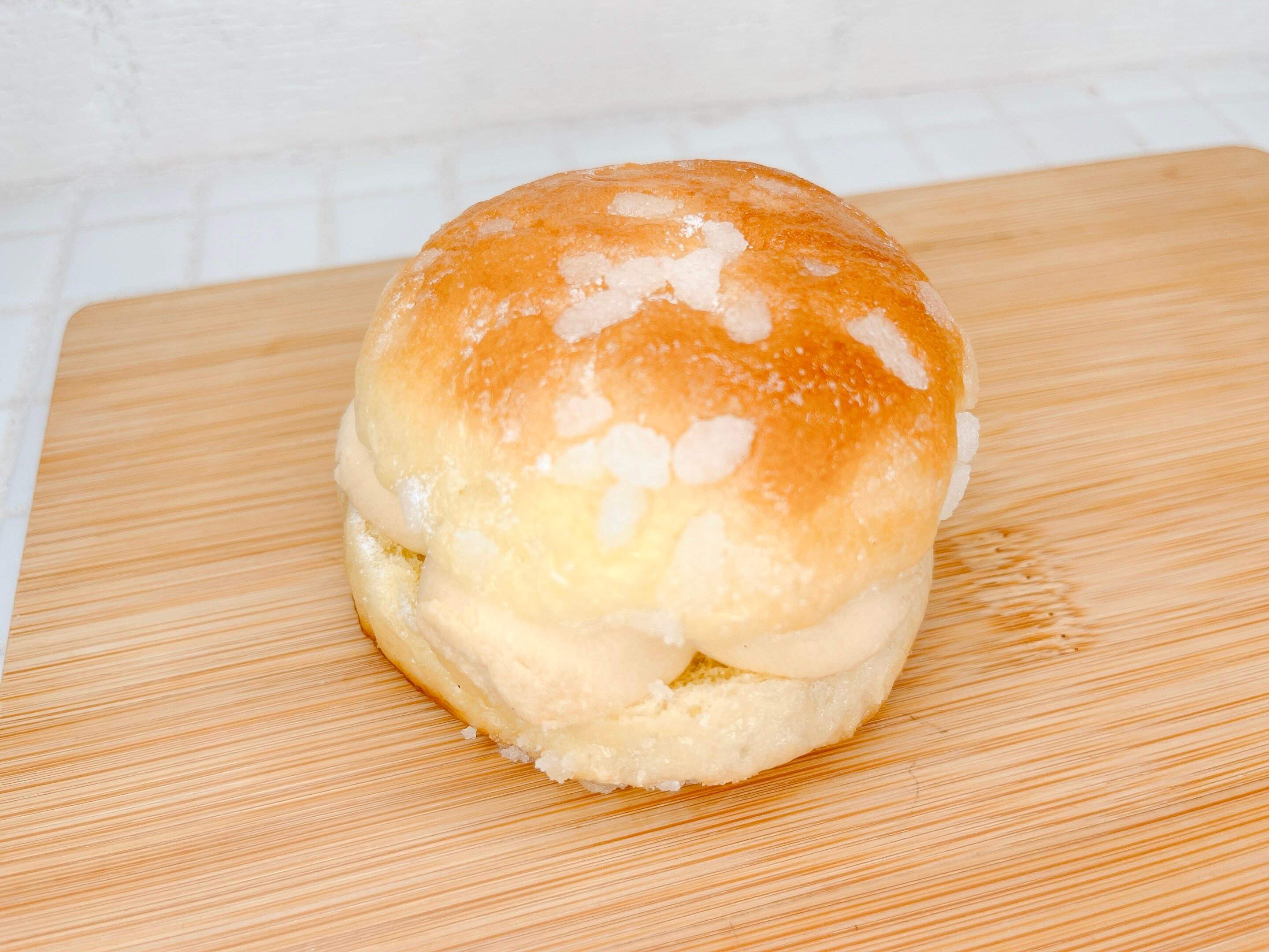 袋から出すとまるい可愛いフォルムのトロペジェンヌが登場!バターの香りがふわっと広がります。触った感じブリオッシュ生地はふわふわで、上部表面にはパールシュガーがたっぷり使用されています。間にはたっぷりのカスタードクリームが挟まれていて、間違いなく美味しそう!!