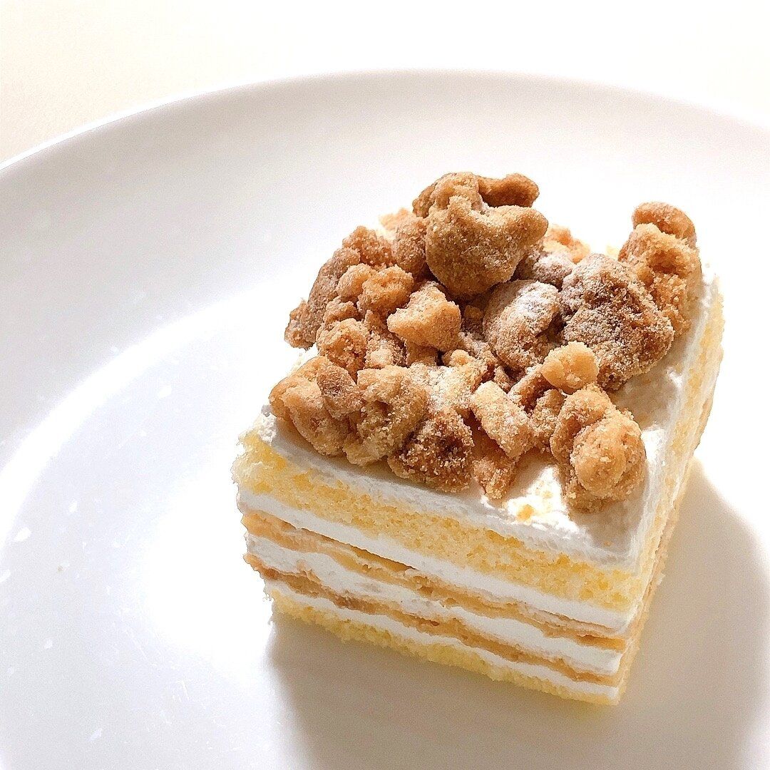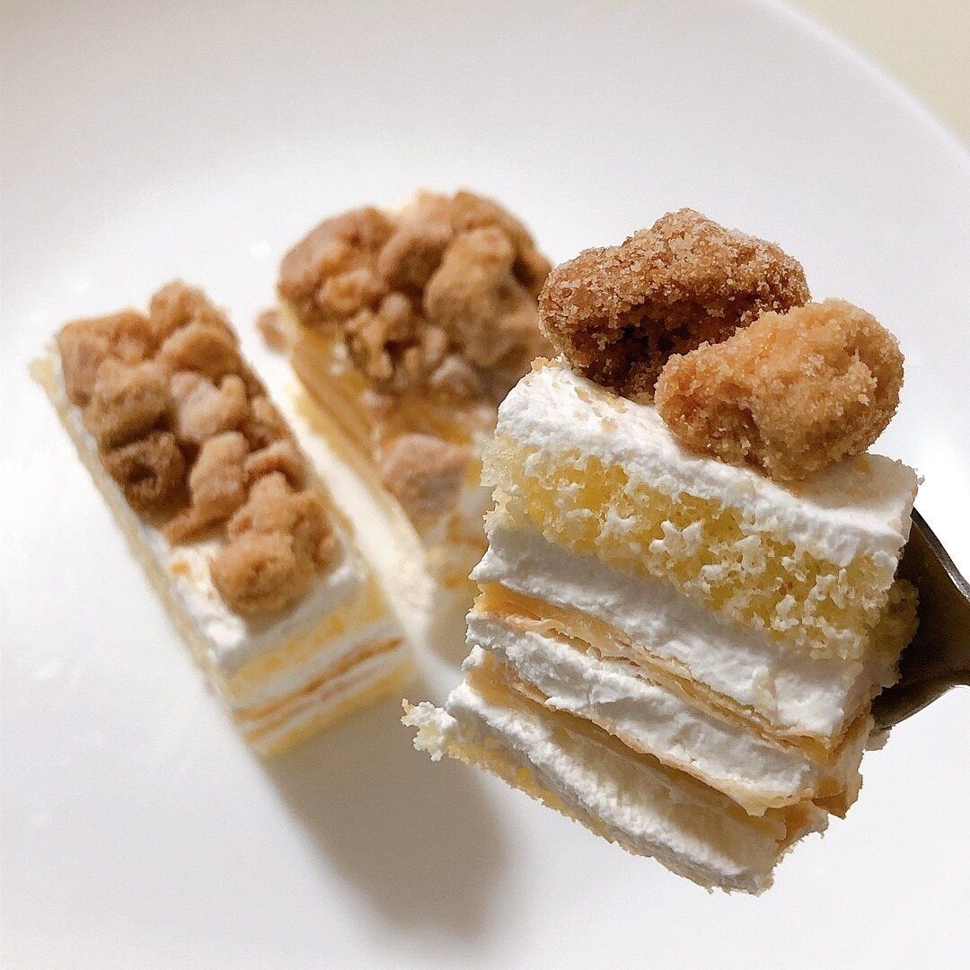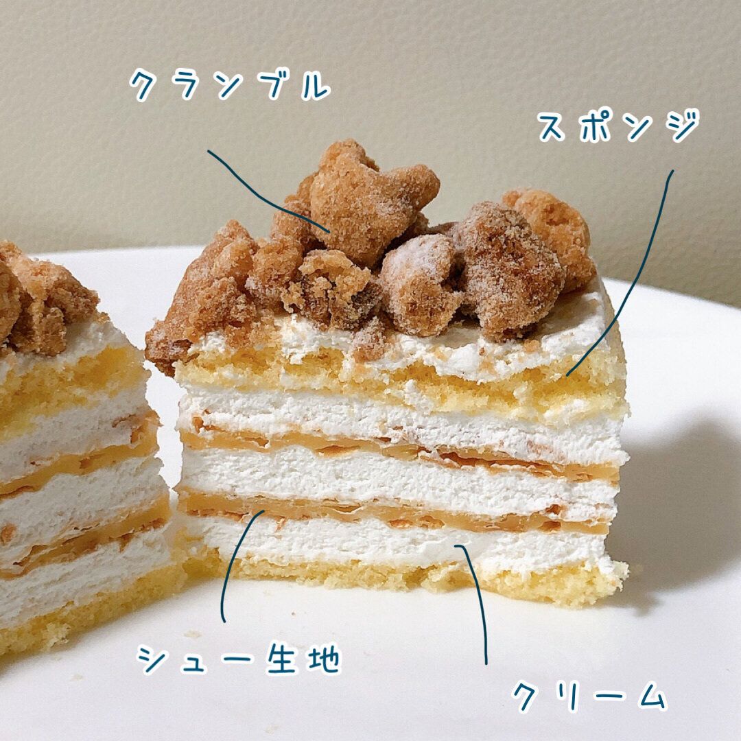 スポンジとクリームがなめらかに口どけ、しっとりとしたシュー生地がアクセントになっています。シュー生地には卵の味が感じられ、ミルキーなクリームをたっぷり飽きることなく味わえます。味はミルフィーユというより、ミルクレープに近い印象でした。ごろごろのったクランブルが香ばしく、食感と味に変化を付けています。