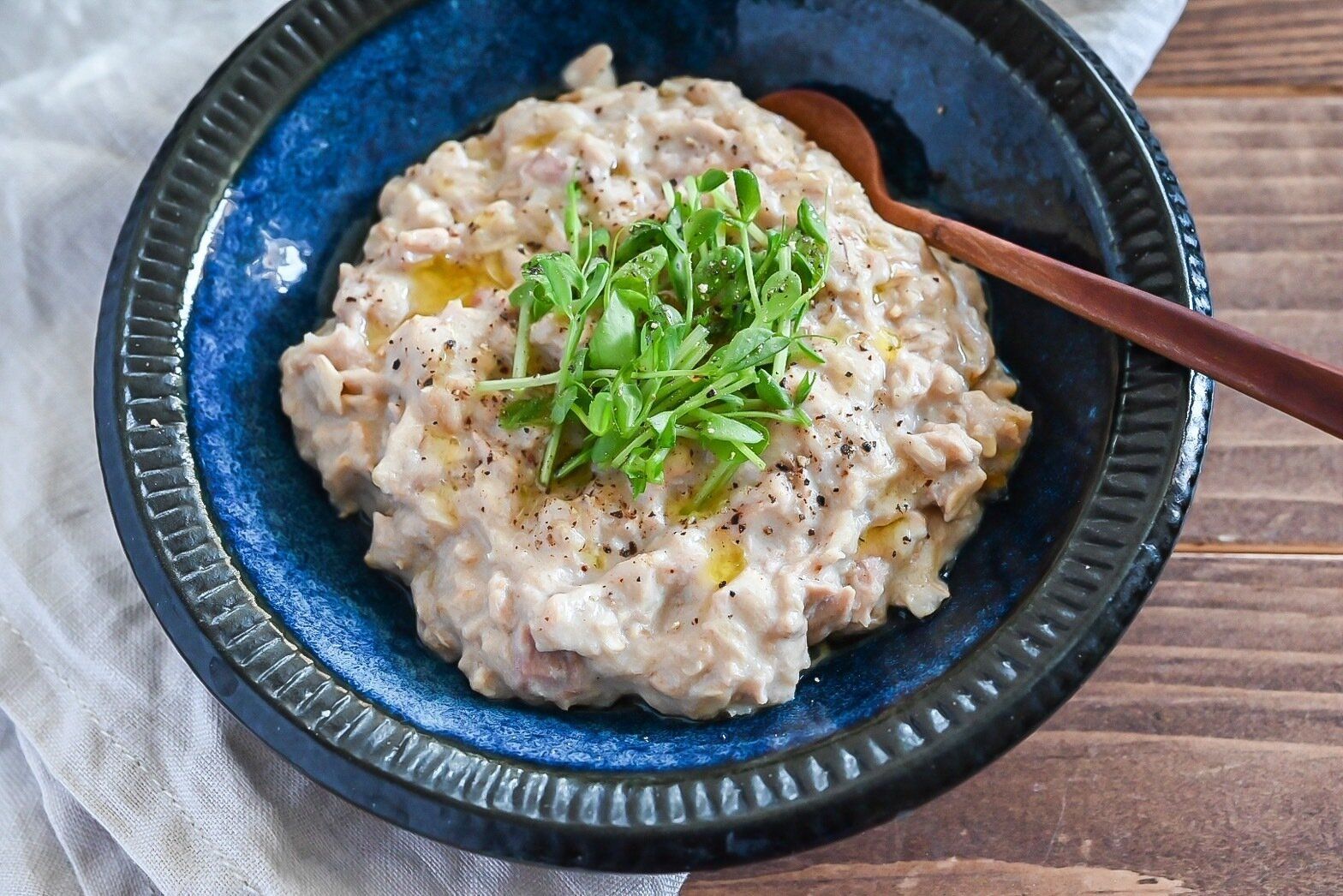 たんぱく質を含むツナ缶、オートミール、豆乳を合わせるリゾットです。