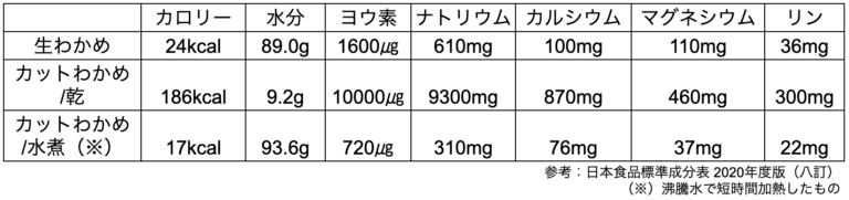 さらにカットわかめを沸騰水で短時間加熱した場合、ナトリウムやカルシウム等のミネラルが水に溶けだすために、生わかめと比べるとミネラル分が少なくなります。