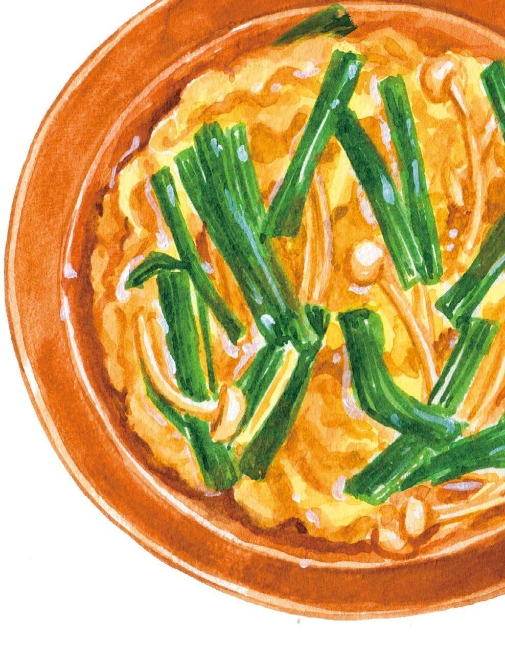 (3)にらを加えてひと煮立ちしたら、溶き卵を回し入れ、ふわっと卵が浮いてきたら火を止める。