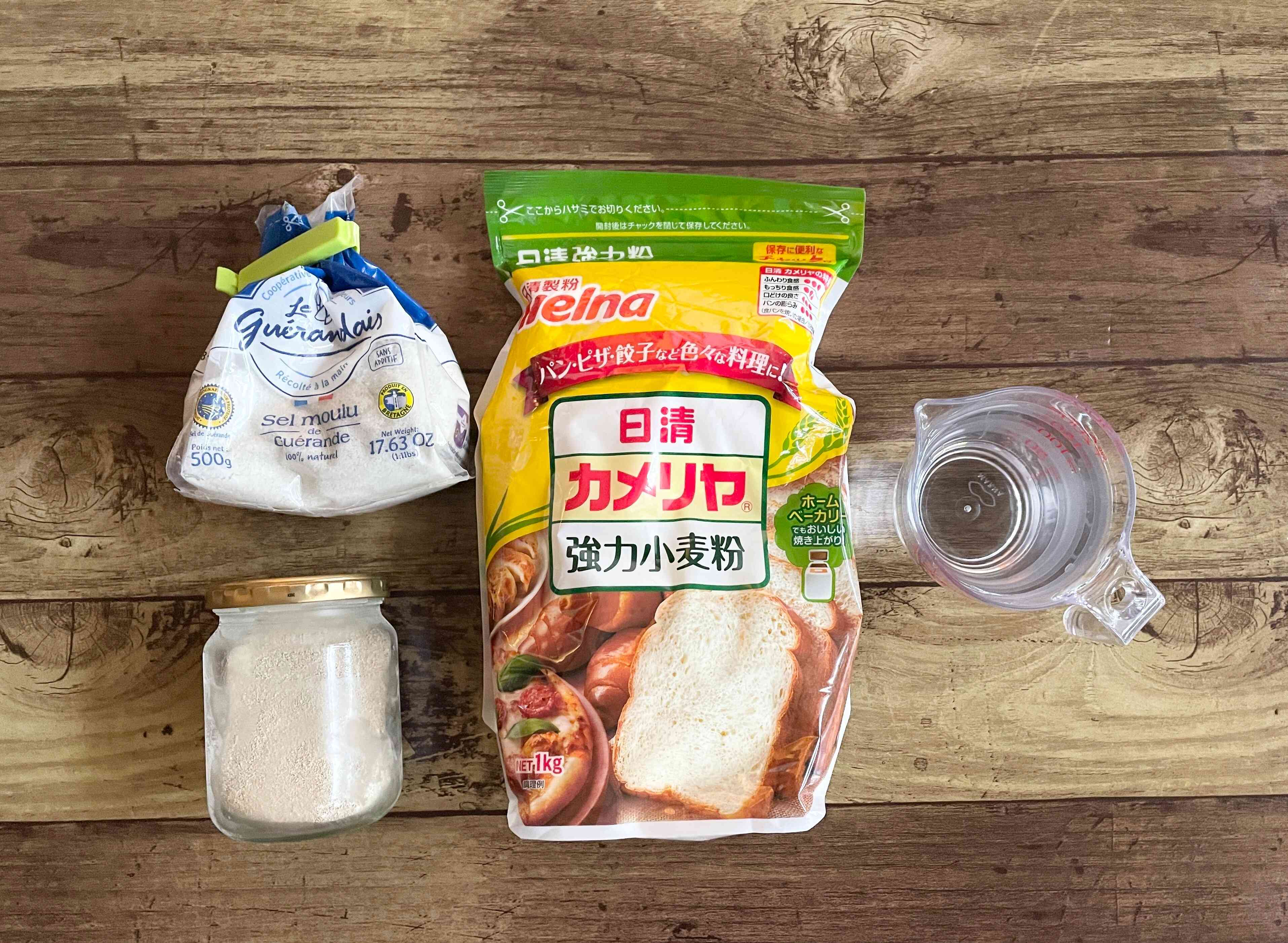 こねないパンの材料はとてもシンプルです。粉と塩とドライイースト、そして水だけ。砂糖やバターも使わないのでヘルシーでもありますね。