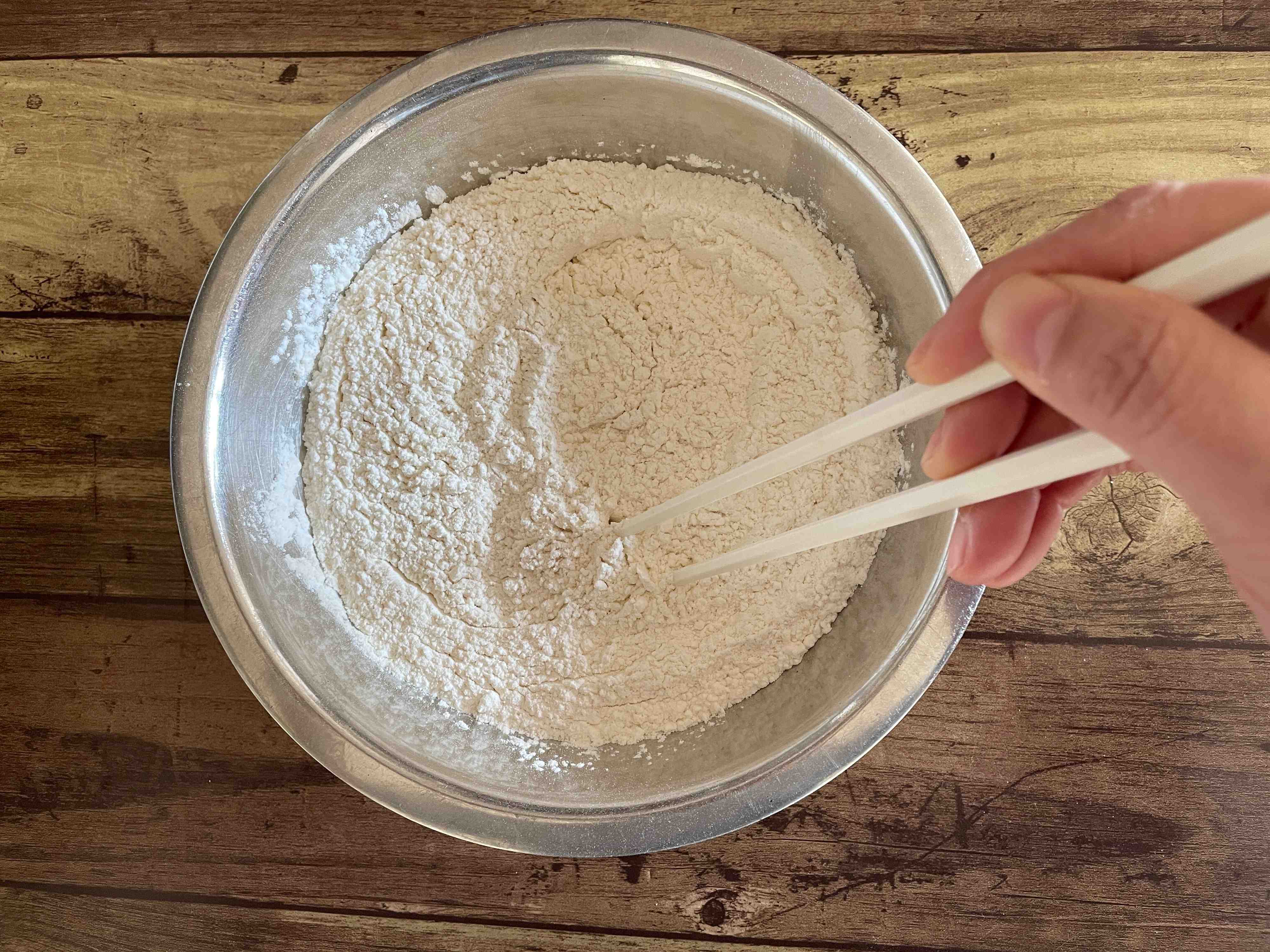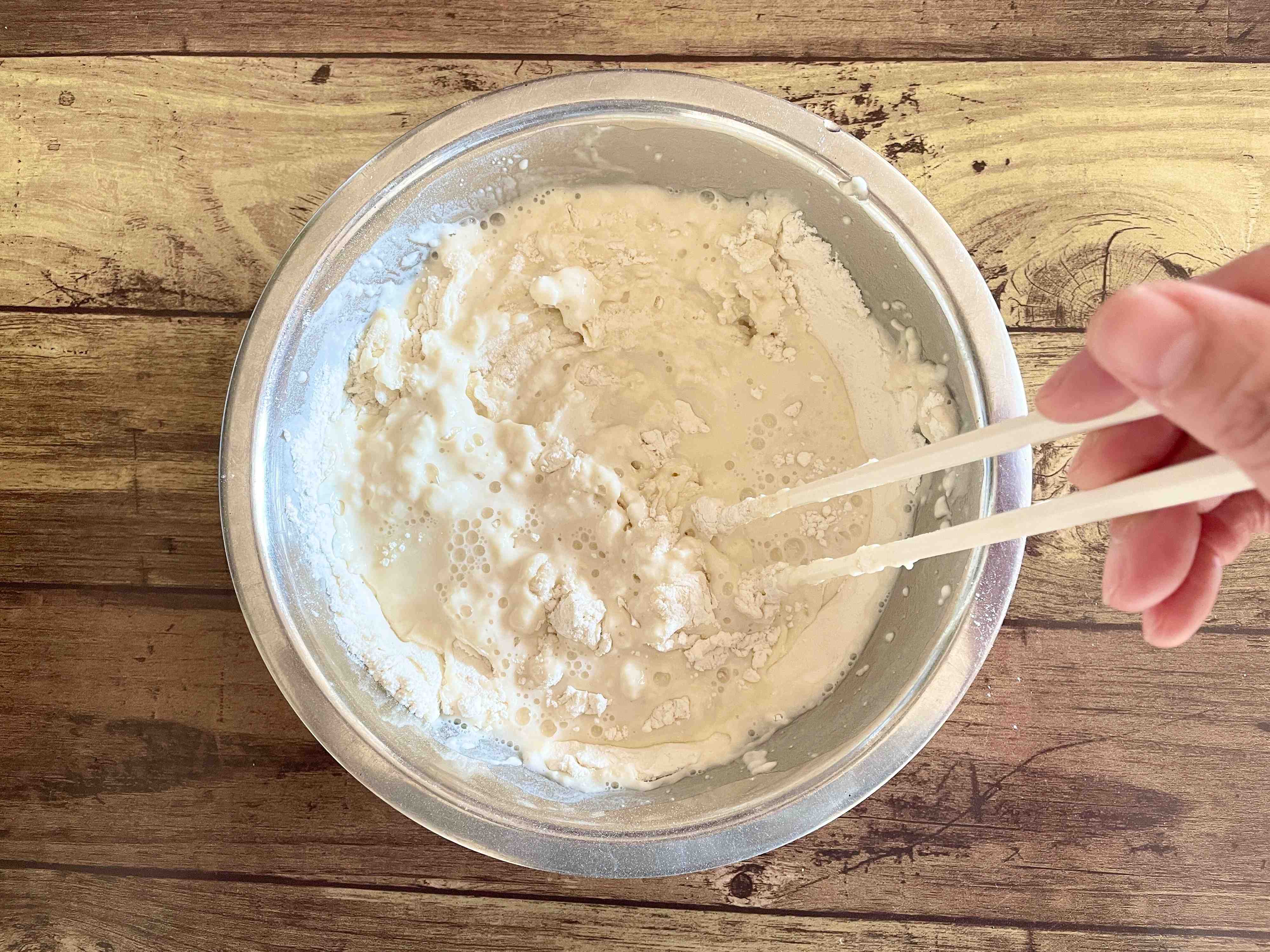 つくりかたは、ものすごく簡単!材料全部を箸でぐるぐる混ぜれば生地は完成です。