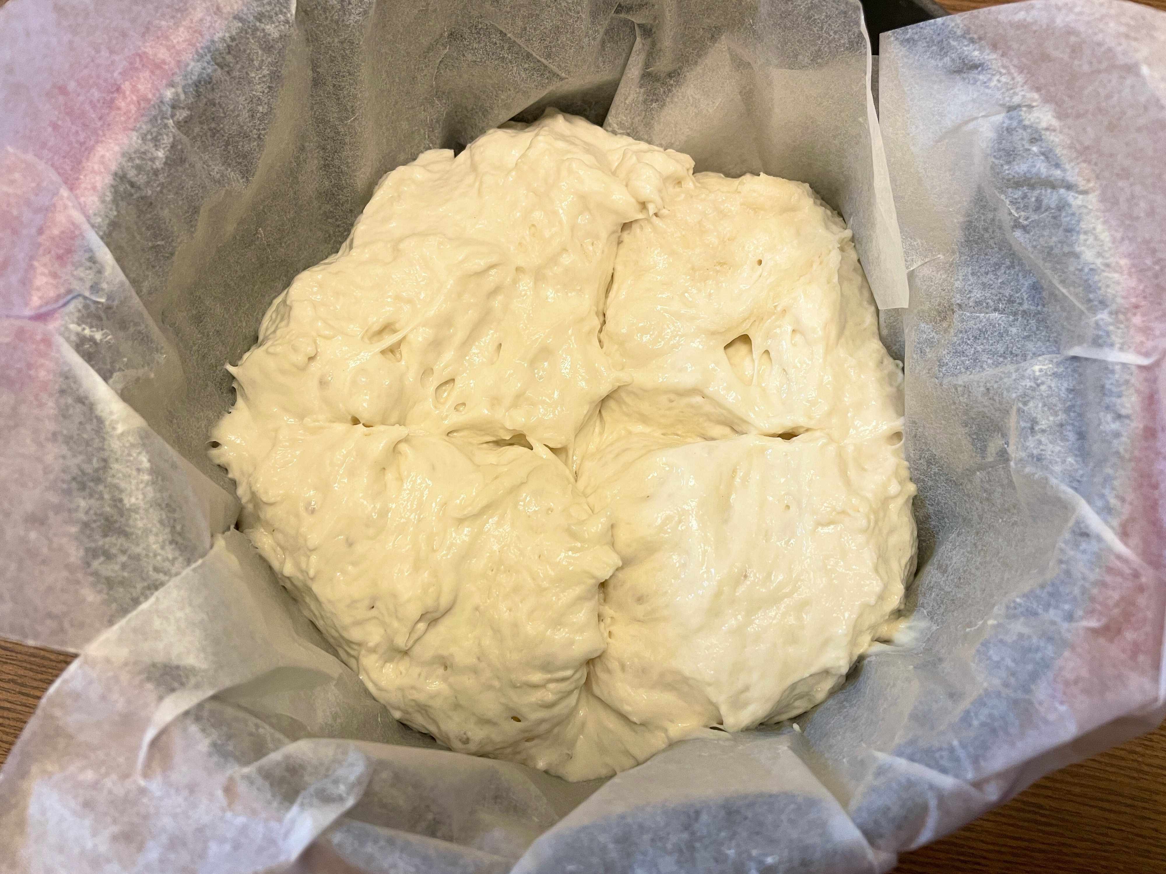 1次発酵が終わったら、オーブンシートを敷いた型に生地を移し、2時間ほど2次発酵をします。