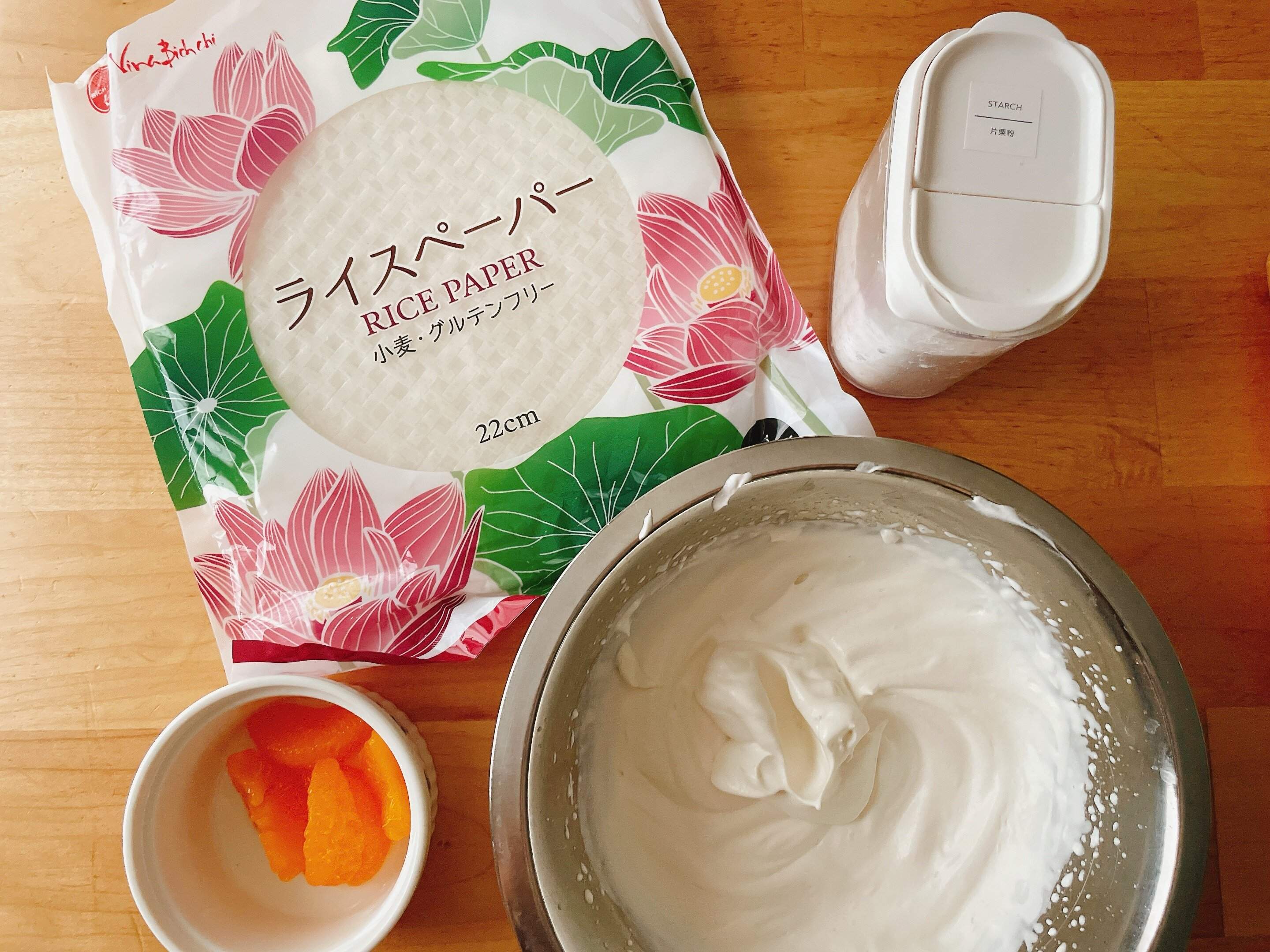 ライスペーパー、片栗粉、生クリーム、好きなフルーツです。今回は缶詰のみかんでつくりましたが、いちご、バナナなど他のフルーツでもおいしくつくれます。