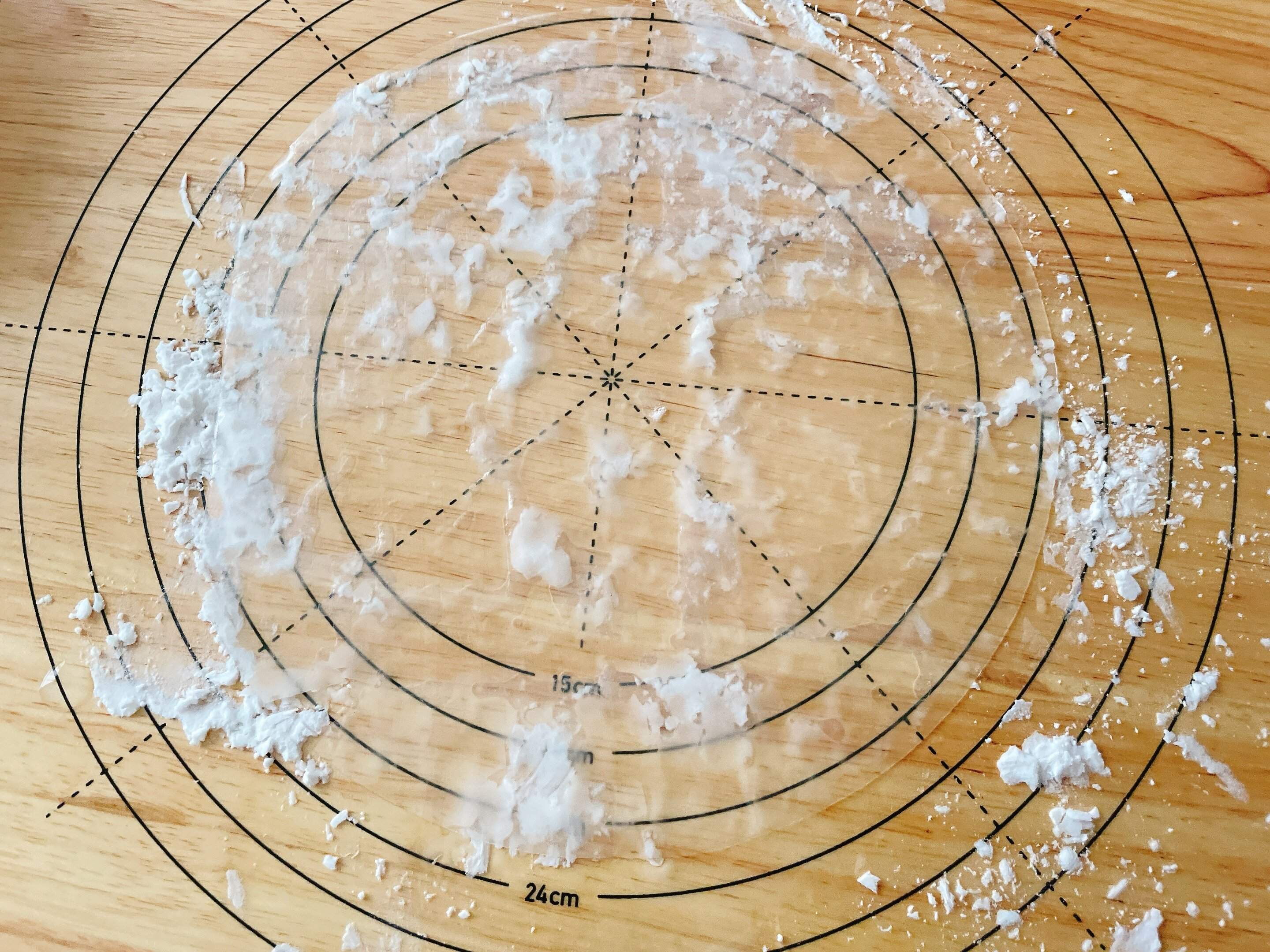 調理台の上に片栗粉を、ライスペーパーと同じくらいの大きさに広げます。