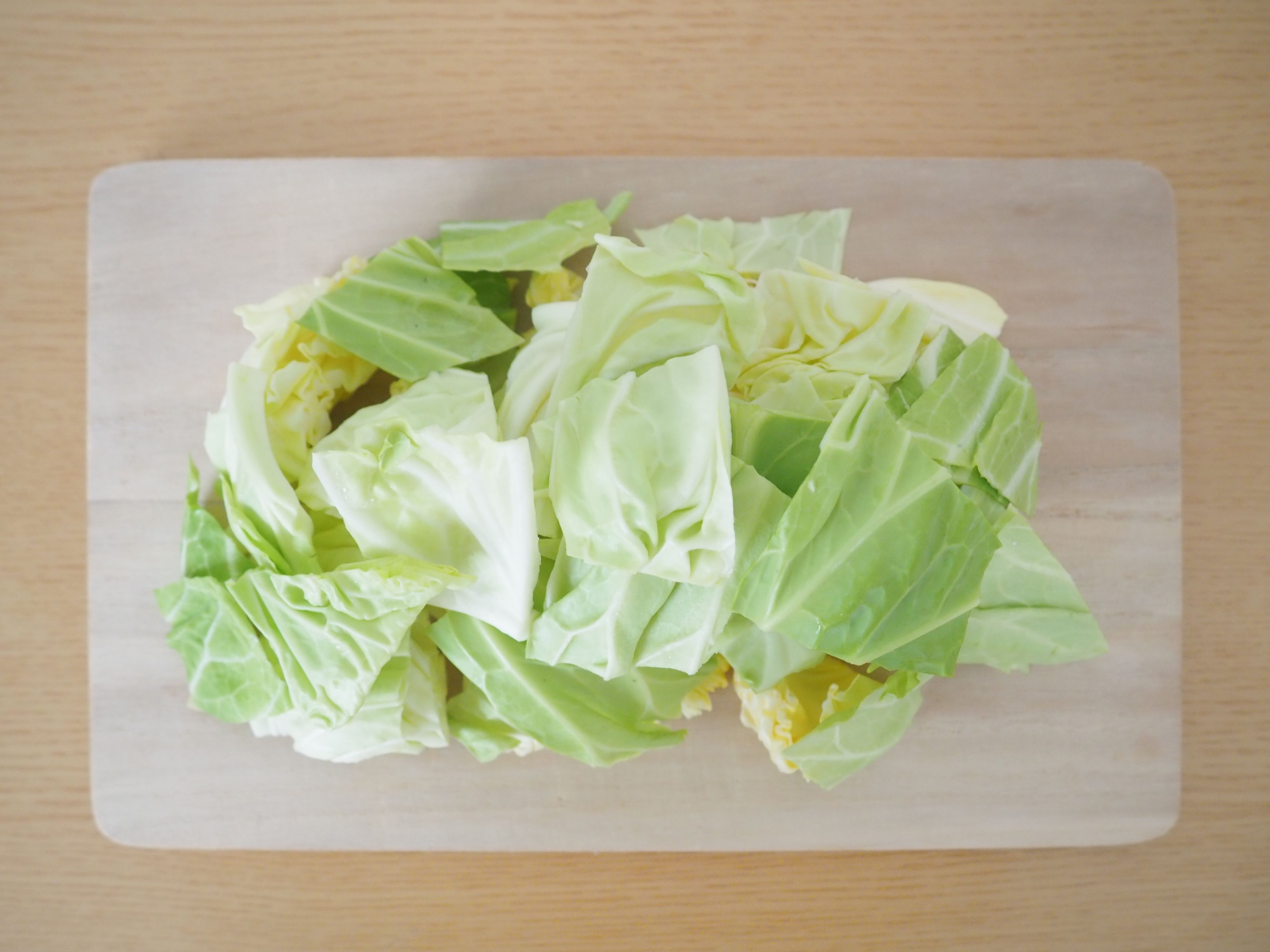 では実際に試してみます。まずは、生のキャベツを一口サイズ大にカット。