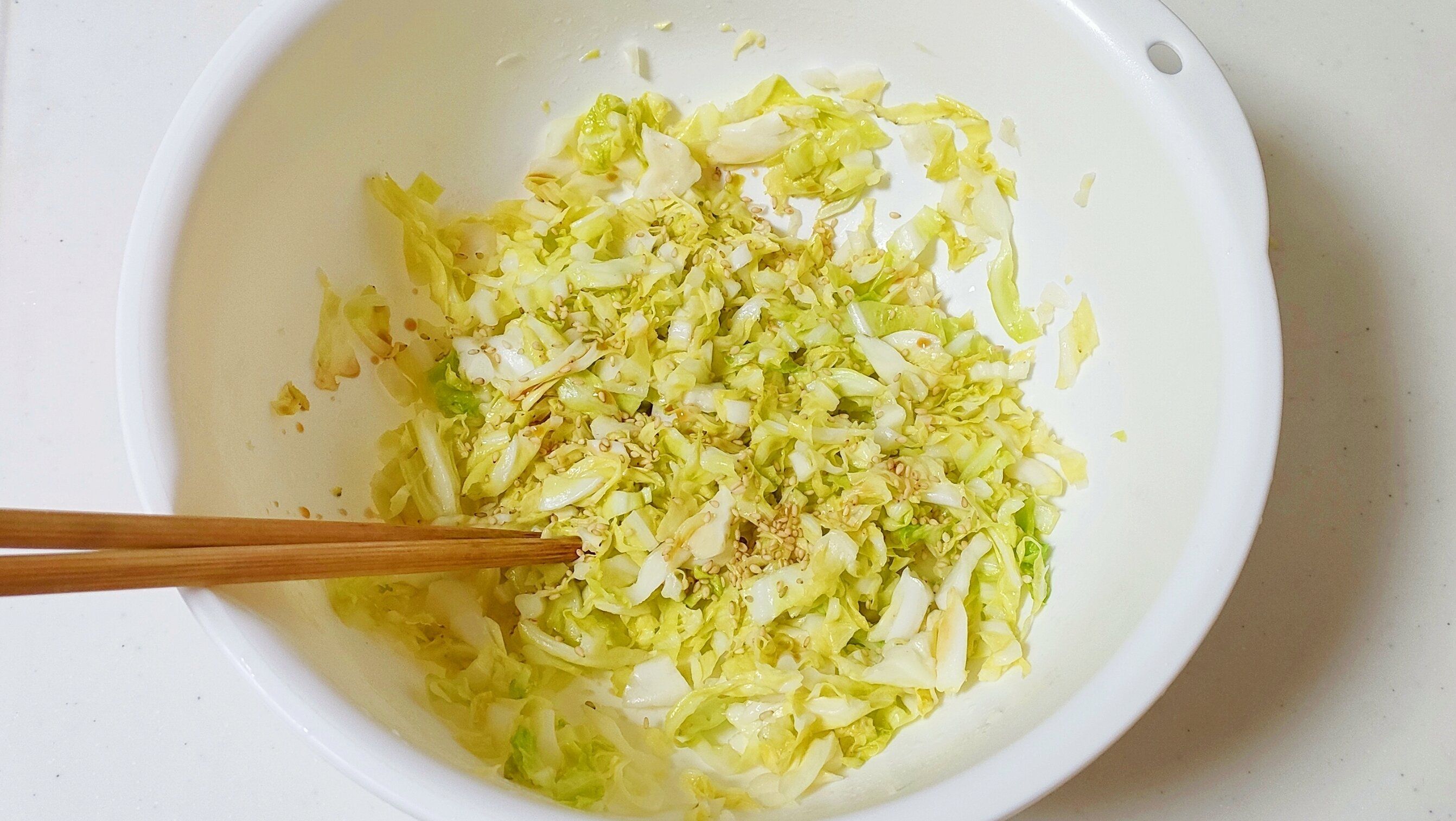 2、ボウルにキャベツ、塩、ごま油、鶏ガラスープの素を入れて軽く混ぜてから、電子レンジ600Wで2分チンする