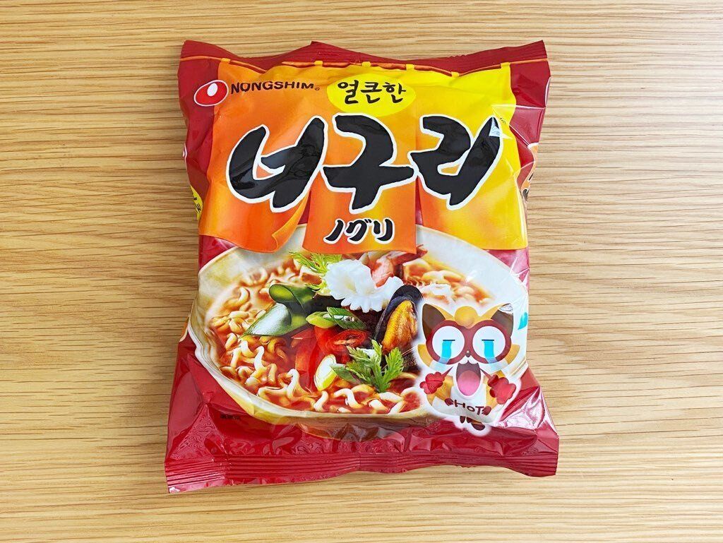 貝やいかなどからとった海鮮エキスに唐辛子、にんにくを合わせた海鮮うどん風のラーメンです。ノグリは韓国語で狸という意味で、丸くて太い麺の形が狸を連想させるということで名付けられたブランド名なんだそう。