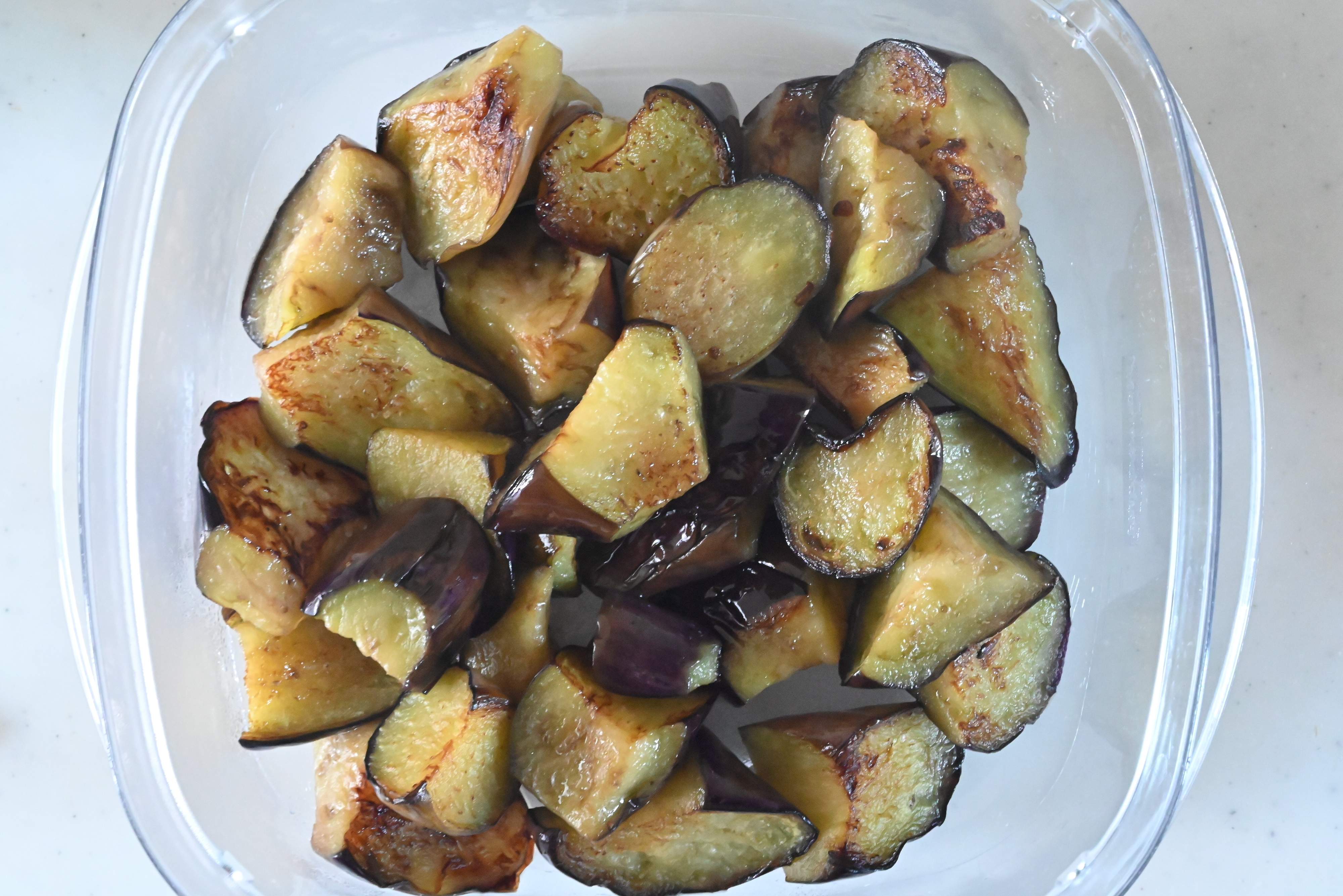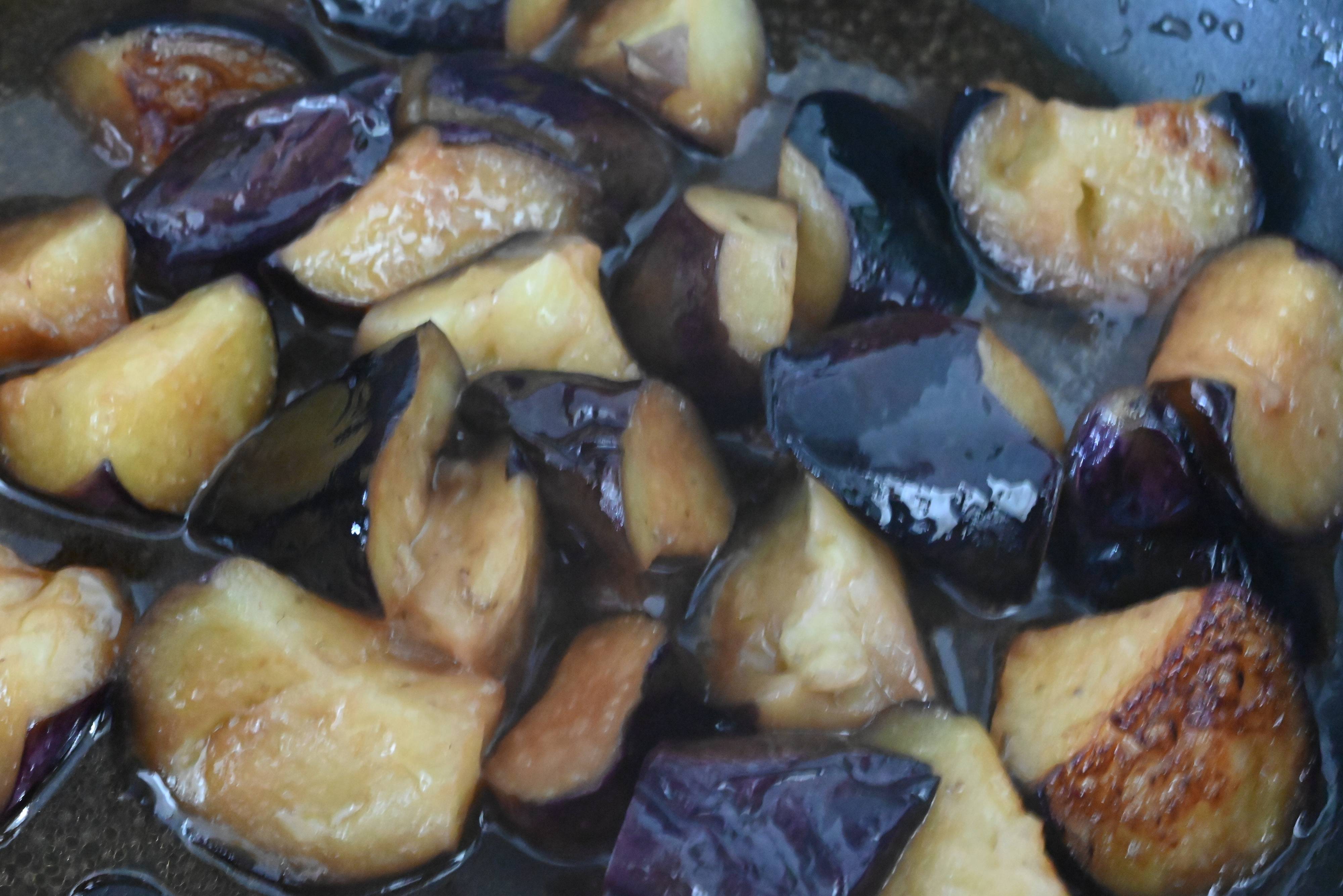 (3)フライパンにオリーブオイルを加えて中火にかけ、なすを炒めたら、密閉できる保存容器に取り出す。