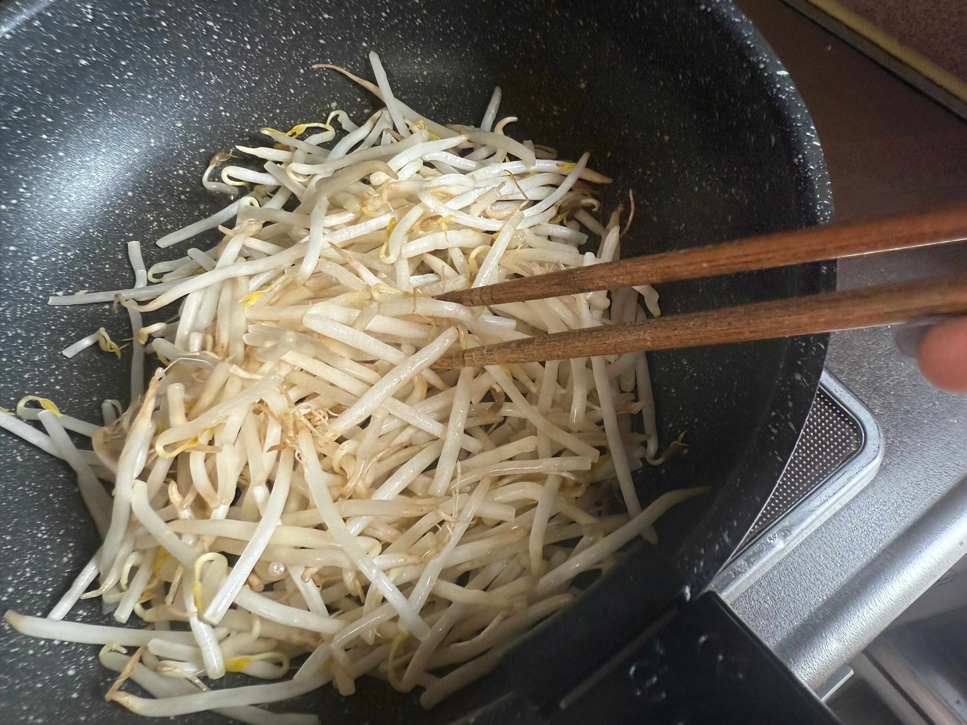 今回初めて、炒める前に洗って水気を軽く切ったもやしに、少量の油を絡めてから加熱してみました。