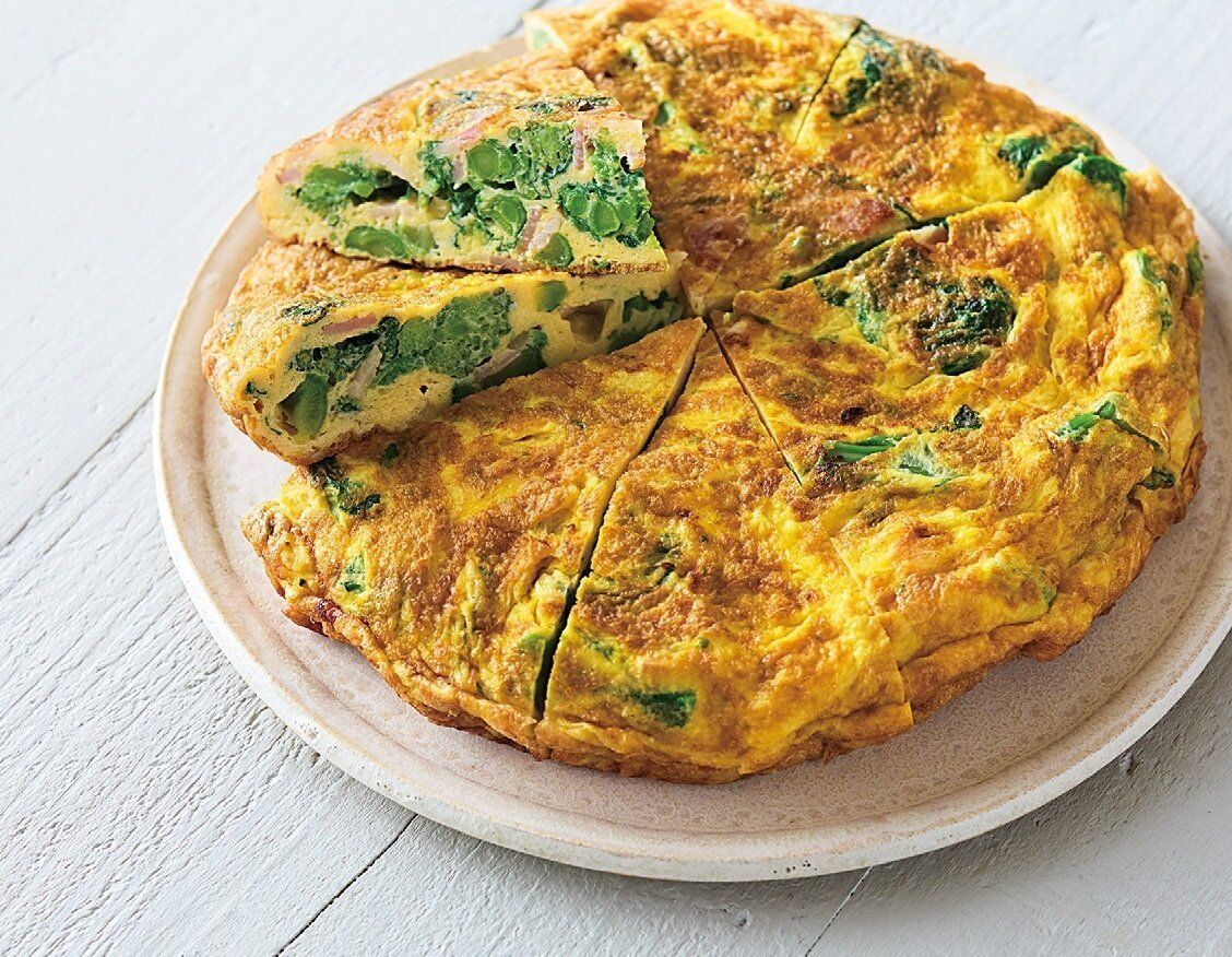 たっぷりの熱湯に塩少々を入れ、菜の花を茎から入れてゆでる。約30秒したら葉先も沈めて約1分ゆで、冷水にとってさます。水けを絞って長さ3cmに切り、太い茎は縦半分に切る。卵を溶きほぐし、菜の花と[A]を混ぜる。直径約20cmのフライパンにオリーブ油を中火で熱し、卵液を流し入れて大きく混ぜ、半熟状になったらふたをして、弱火で約1分蒸し焼きにしたら返し、さらに約7分蒸し焼きにする。食べやすく切る。