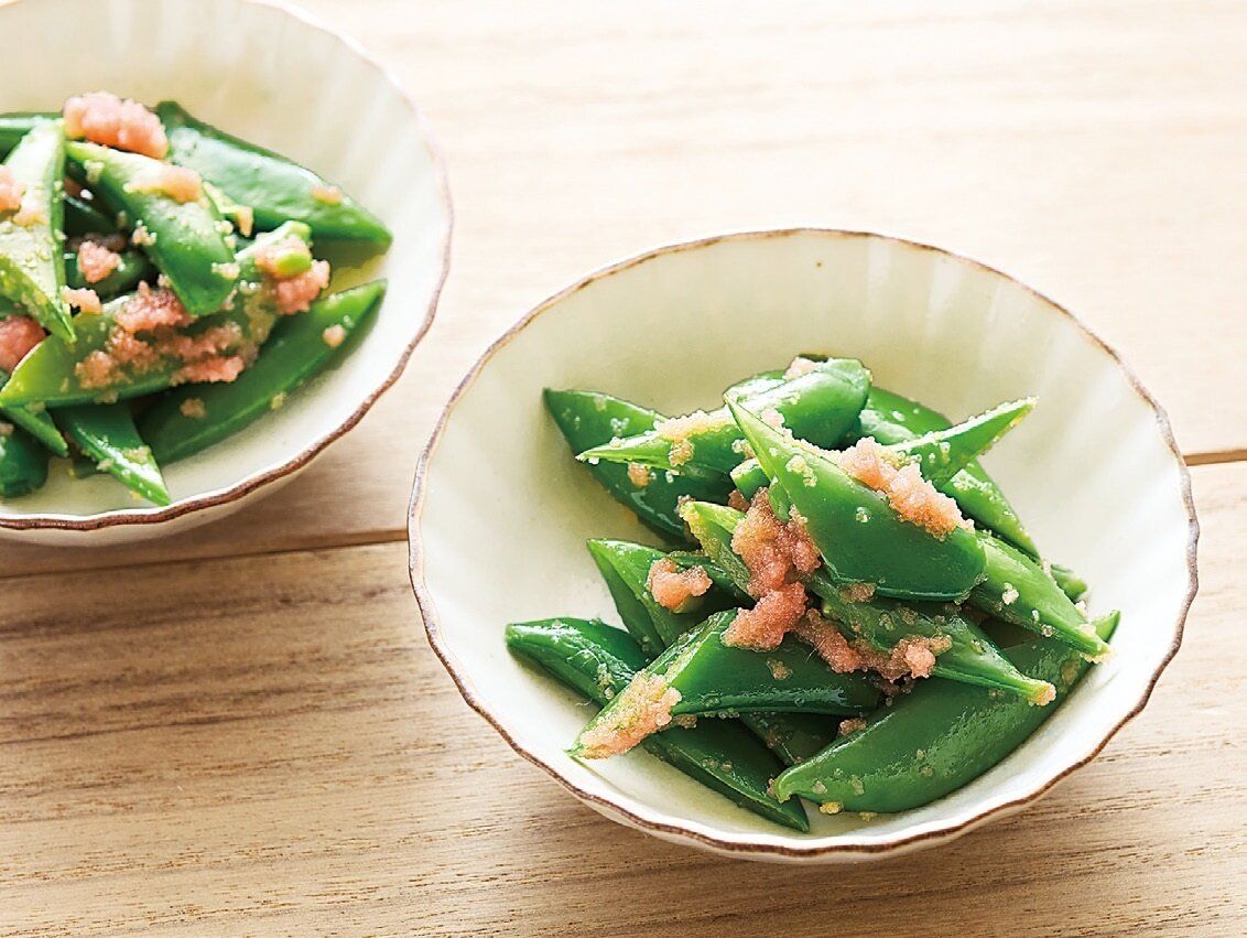 たっぷりの熱湯に塩少々を入れ、スナップえんどうを入れて約1分ゆでる。ざるに上げ、粗熱を取って斜め半分に切る。たらこは薄皮を除いてボウルに入れ、ごま油、塩少々、スナップえんどうを入れてあえる。