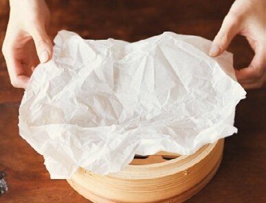 せいろを汚したくないときは、オーブン用シートを敷いてから野菜を詰めます。蒸気が通りやすいように、シートをくしゃくしゃにして敷くのがコツ。