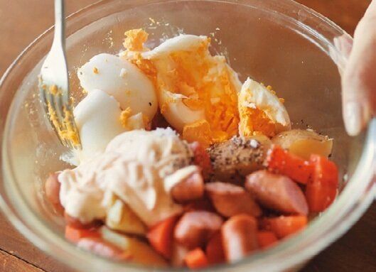 (2)粗熱が取れたら、マヨネーズ大2、塩小1/2、粗びき黒こしょう適量を加え、つぶしながら混ぜる。