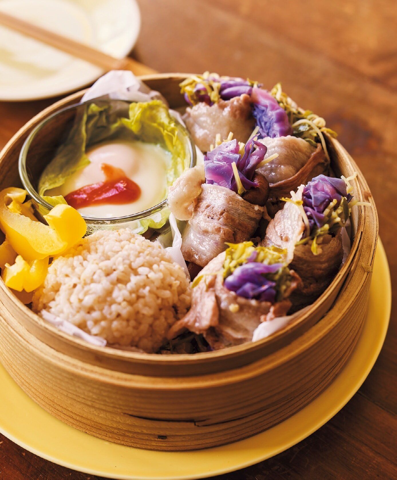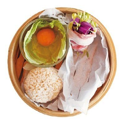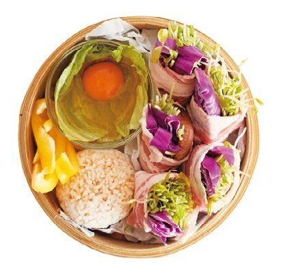 しいたけの内側にみそを薄く塗り、みそを塗ったほうを上にして広げた豚肉にのせる。豆苗、紫キャベツを重ねてのせ、端から巻く。レタスは半分に切って小さめの耐熱の器に敷き、卵を割り入れる。冷凍ご飯はラップをはずし、オーブン用シートにのせる。