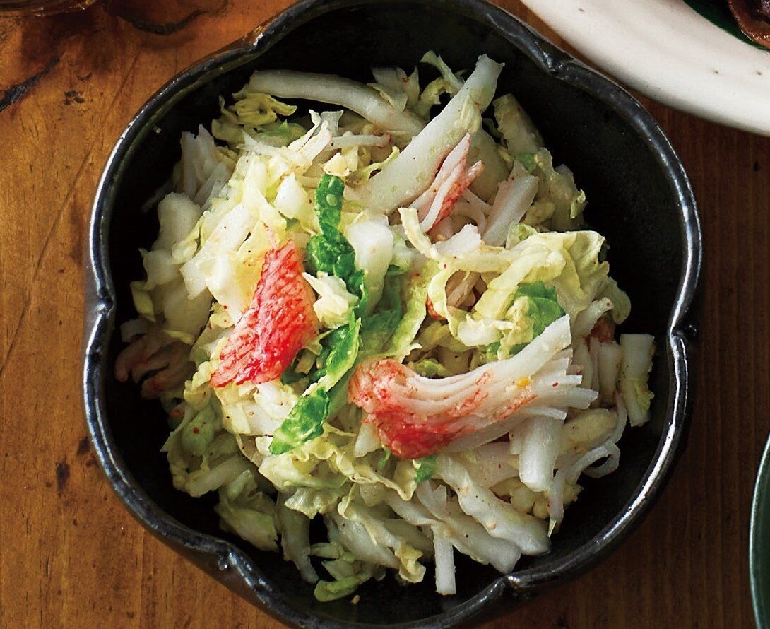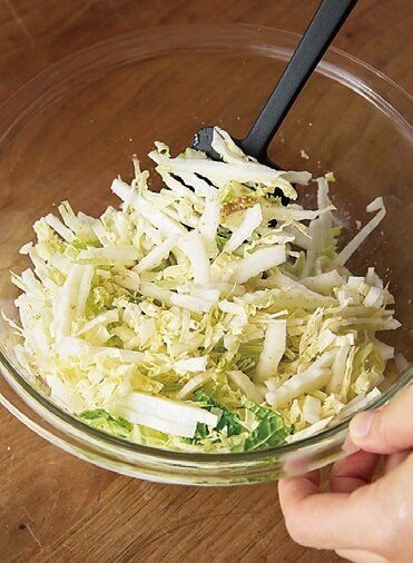(1)のボウルに白菜を入れてしんなりするまで混ぜる。かにかまをほぐして加え、混ぜ合わせる。