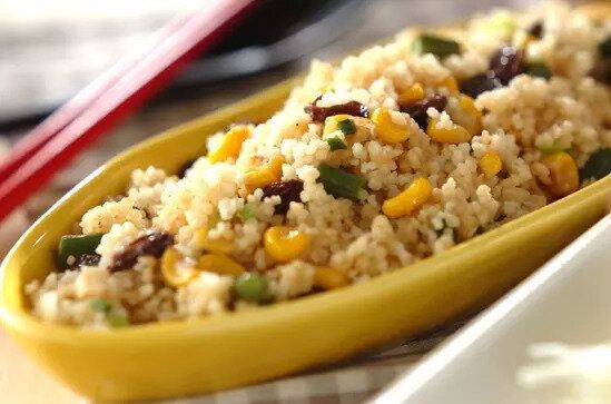 中東料理でよく使われるクスクス(粒状のパスタ)を日本人に馴染みが深いバター醤油で味付けしました。コーンやレーズンも入って、お子さんでも食べやすい味付けになっています。