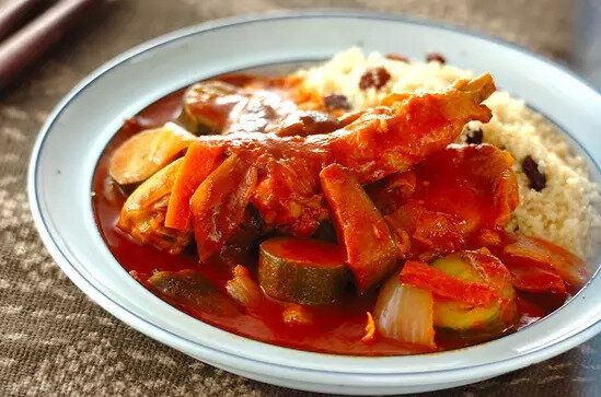 骨付きの鶏肉とたっぷりの野菜をじっくり煮込んだ一品です。つけ合わせのクスクスはレンジ加熱で時短。日本でもブームになったハリッサとカレー粉でスパイシーな仕上がりです。