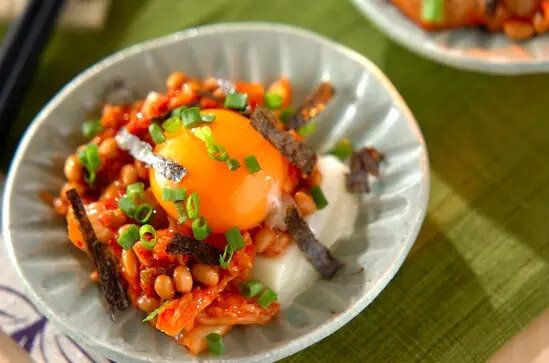 お餅をレンジで温めバターを絡めた後は、材料を乗せていくだけで完成!卵黄を乗せることでキムチの辛さがマイルドになります。発酵食品のキムチと納豆の相乗効果で整腸作用が期待できます。忙しい朝にもおすすめです。