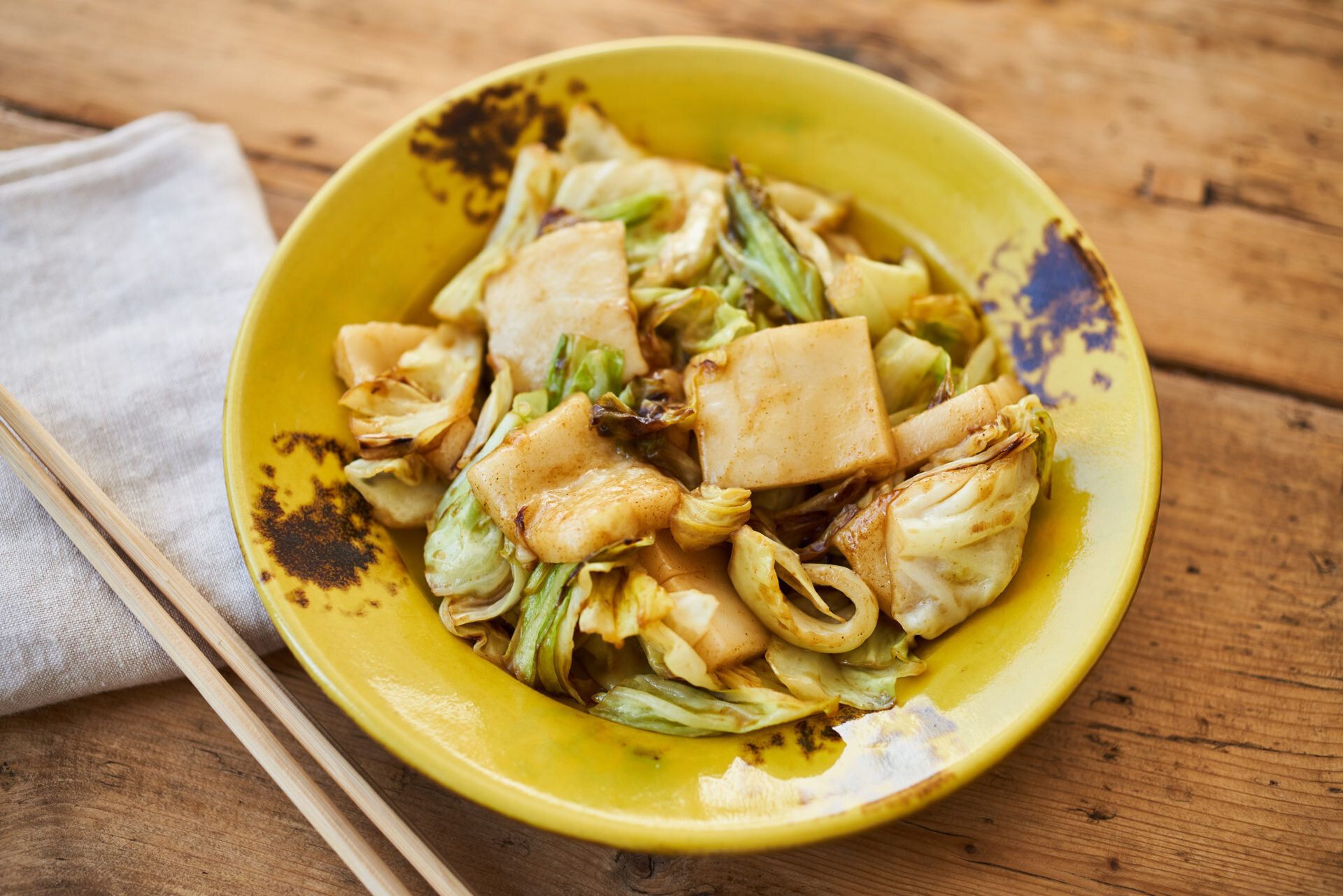 ごま油で炒めたキャベツに、柔らかくしたお餅と調味料を入れて炒め合わせるだけ!福島県郡山市の郷土料理「キャベツ餅」をカレー粉を使ってアレンジしました。カレーの風味でついついご飯もすすんでしまいそうなおかずです。