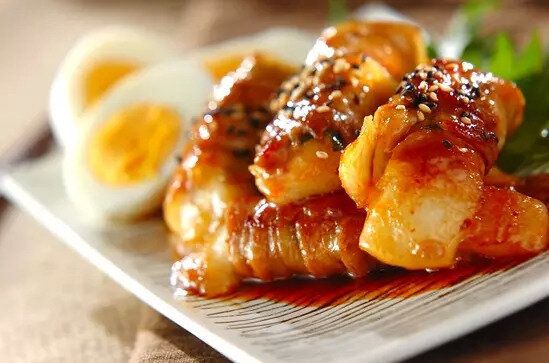 お餅を豚バラ肉で巻いたボリューム満点のレシピです。韓国風のピリ辛タレが食欲をそそります!お肉の旨味がお餅に絡んで、いくらでも食べられそう。大葉を一緒に巻く事で、さわやかさも彩りもアップします。