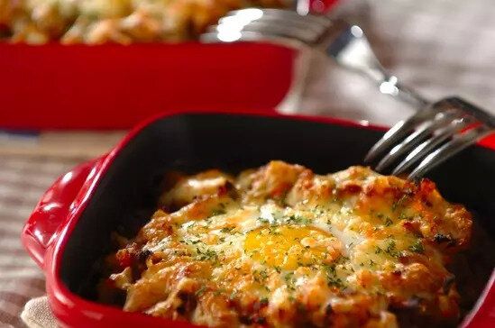 耐熱皿にお餅、カレー、卵とチーズを乗せて焼いたドリアのお餅バージョンです。年齢を問わず人気のメニューなので、家族からも代行費間違いなしです。残ったカレーのリメイクレシピとしても活躍してくれそうです。