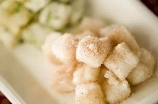 クリームチーズ、ラムレーズン、オレンジピールをお餅で包んだ大人のデザート。見た目も可愛いので来客時にも活躍してくれそうです。一口サイズで、ついつい食べすぎてしまいそうです。