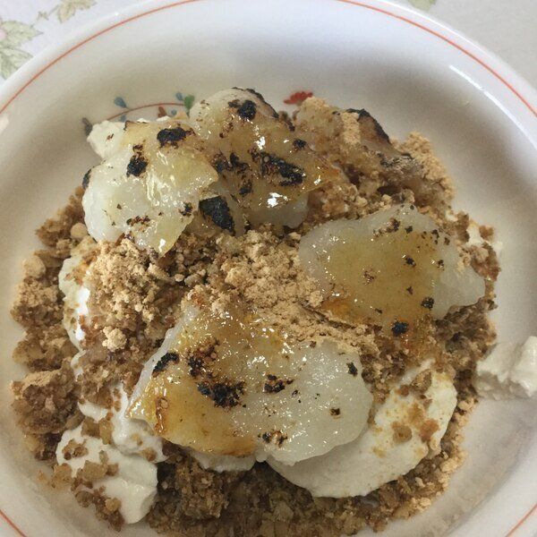 焼いた豆餅の香ばしさがとお茶の香りがお互いを引き立て合う一品です。お茶の種類を変えて試してみるのも楽しそうですね。
