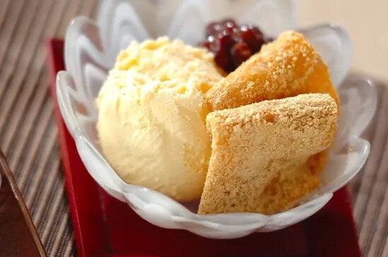 しゃぶしゃぶ用のお餅を活用した、和スイーツのレシピです。熱湯に通したお餅にきな粉をまぶすだけで、まるで八ツ橋のような味わいに!アイスやあんこの他、コーンフレークやチョコなどお好みのものを追加してパフェ風にも。