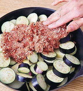 (2)(1)のじゃがいもとなすは水けをきる。フライパンにじゃがいもを平らに並べて塩少々をふり、なすをのせる。(1)のひき肉を全体に広げてのせ、フライパンの縁からオリーブ油を加える。